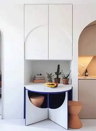 As you can imagine, when it comes to mastering a small space, it takes some creativity, and some hefty intuition to perfect it. And if you’ve got the budget, why not increase the functionality of your home with custom features that are movable so you can take them with you to your next rental? Take the handy breakfast nook featured above, for instance. To save space, the extended leaf boasts a base that swings closed to create what’s an otherwise standard, sleek alcove that’s flush with the walls around it. Think custom built-ins that boast ample concealed storage to make the most of any space.