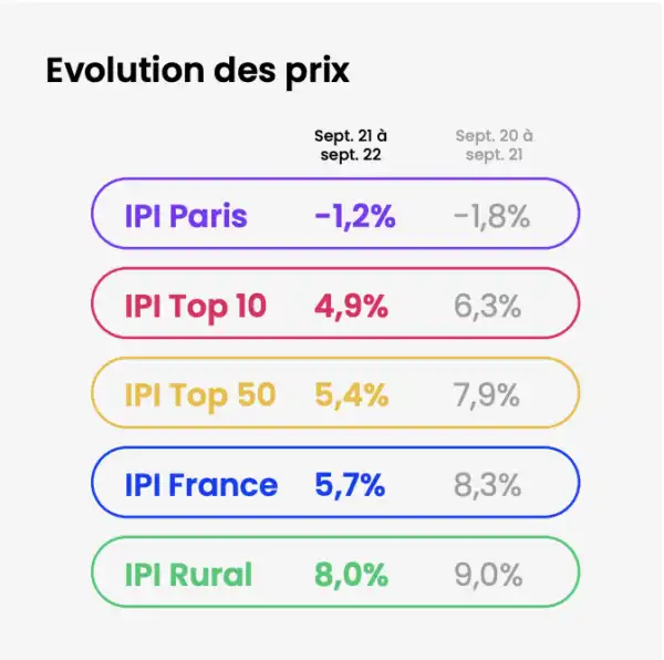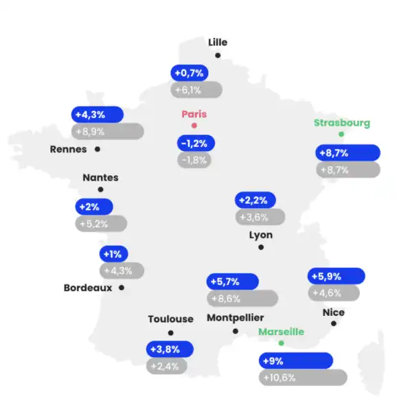 The largest cities in France (Top 50 and Top 10) are experiencing an increase of around 5%. Paris, though, has seen a drop of -1.2%, compared to the drop of -1.8% observed last year.
