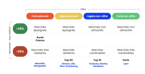 There is an overall shortage of supply but not in all of France. Different realities exist depending on the territory. The shortage is exacerbated for the rural world with stocks at 50% since 2019. However, the urban markets such as in the Top 10 and Top 50 cities see supply gradually being rebuilt. At the other end of the spectrum, the Paris market is in a situation of oversupply at its highest compared to the last 4 years.