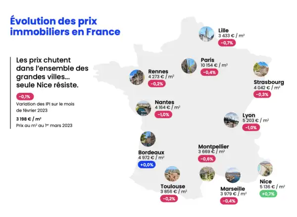 Already weakened by the health crisis, France’s main cities seem to have gone into negative territory. While Nice is still the exception, with rates up +0.7% in one month, no other city has escaped this downward trend. Marseille, itself, which until then had been pulling the market upwards and experiencing spectacular growth (+11.2% in one year), recorded a -0.4% drop in prices in February of this year. The strongest drops returned to Lyon and Nantes which, both, saw their prices fall -1% during February and more than -2% since the beginning of the year (-2,4% in the prefecture of the Rhône and -2,2% in that of Loire-Atlantique).