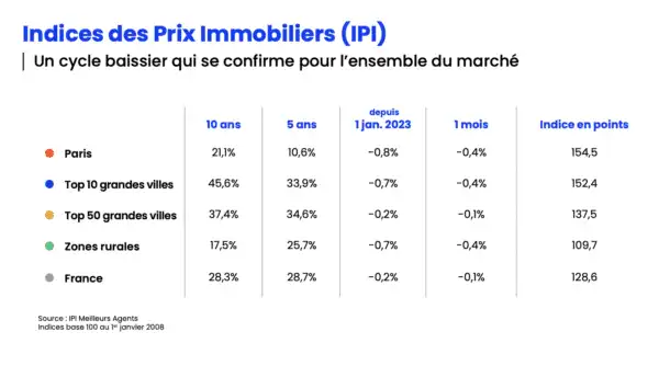 The year 2023 is off to a slow start for the French real estate market. Since the beginning of January, prices at the national level have fallen by -0.2%. Since the end of 2022, all areas of the real estate market have gone into the red, a phenomenon we have not seen since 2014. While the capital remains unsurprisingly on a downward trend (-0.4% over the past month), this is now the case for all the French municipalities in the Top 10 (-0.4%) as well as those in the Top 50 (-0.1%). The rural areas which, since the Covid pandemic moved the market forward, continue to see their prices falling as well (-0,4%). Usually, February marks the end of the winter break in terms of price changes. In other words, after the traditional lull in November, December and January, prices usually begin to rise each month during the spring surge.