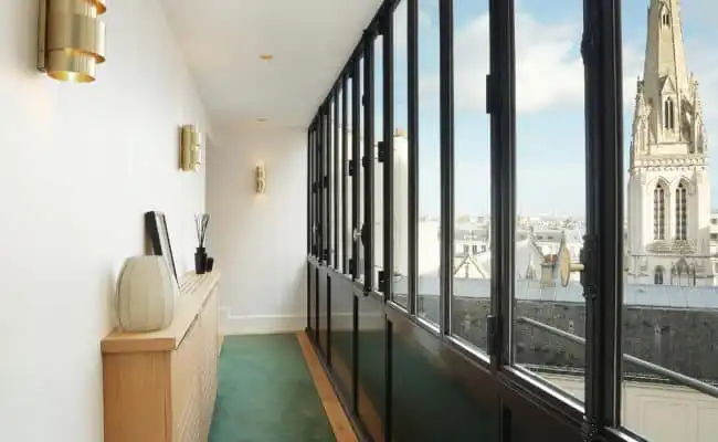 A spectacular ‘gallery’ style entrance with glass wall featuring panoramic views over Paris