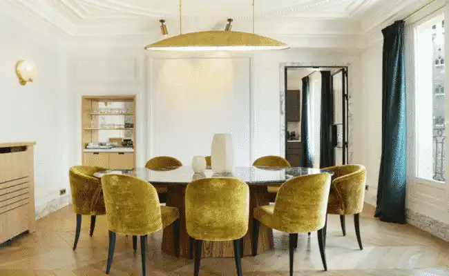 The dining area is furnished with a massive round table and custom lighting, perfect for entertaining guests