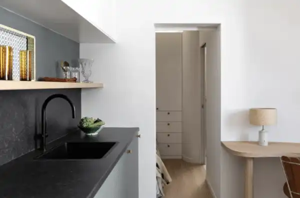 In the heart of Paris, adjacent to the iconic Arc de Triomphe, a diminutive 183-square-foot apartment has undergone a remarkable metamorphosis, marrying intelligent design with aesthetic finesse. Céline Boclaud, the visionary architect behind this transformative project, has infused the compact space with a harmonious blend of soft curves, pastel palettes, and inviting materials.