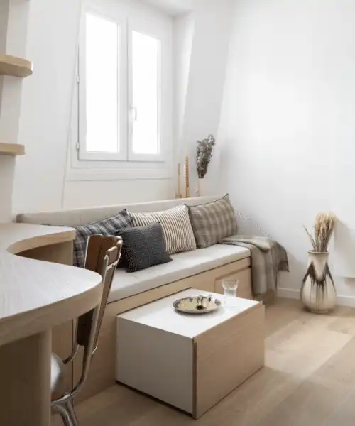 In the pursuit of spatial efficiency, integrated furniture becomes a cornerstone, supplemented by curated elements such as a vintage chair, a ceramic lamp with a raffia shade, and understated bed linens. The color palette, characterized by soft tones of warm wood, earthy hues, and ochre accents, imparts a sense of intimacy to the parquet floors, the linen weavings of the sofa bed, and the mosaic tiles adorning the bathroom.