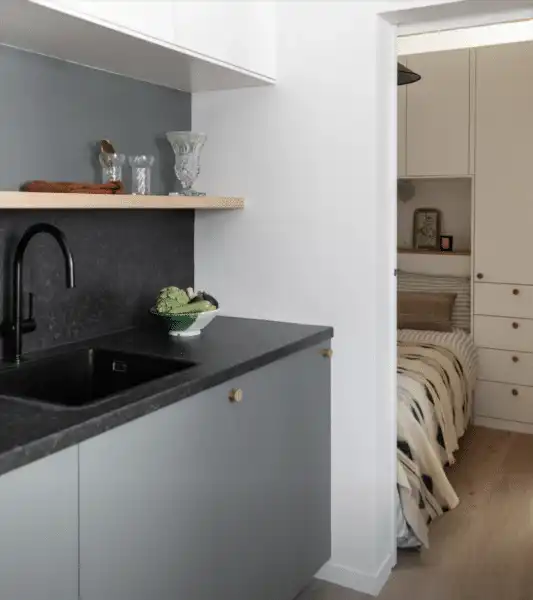 The lounge area, strategically juxtaposed against the kitchen, unveils a multi-functional bench that seamlessly transforms into a bed. Cleverly integrated elements, including a built-in coffee table, storage compartments, and a desktop niche doubling as a petite nightstand, underscore the dexterity of the design.
