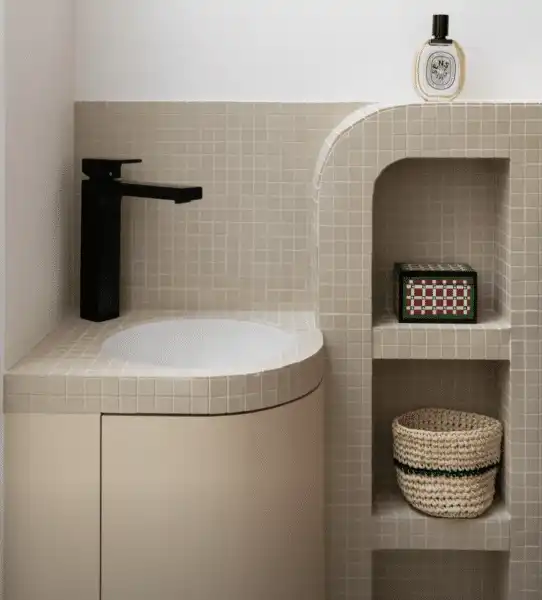 Navigating the challenges posed by the curved wall, Céline Boclaud deftly crafted a free-form worktop that embraces the sinuous contours, complemented by undulating shelves above. The bathroom, adorned with a small partition and a gracefully rounded, tiled vanity unit, introduces an element of curvature, echoing the design ethos pervading the entire space.