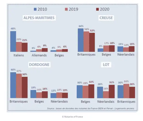 Surprisingly, it is not the big cities that are the most sought after. The Creuse and the Dordogne are the most attractive. They are followed by Alpes-Maritimes, Haute-Savoie and Lot. In 2020, foreign customers represented 9% of sales in Creuse, 8% in Dordogne, 7% in Lot and 5% in Alpes-Maritimes.