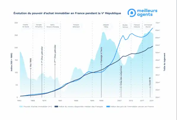 As the presidential elections quickly approach, with a first round in less than 6 months, Meilleur Agents, leader in online real estate valuation, analyzes the evolution of the real estate purchasing power of the French property market under the Fifth Republic (1958 to present). Oil shocks, changeover to the Euro, subprime crisis, Covid19 … Which crises have really impacted the real estate sector? What is the real estate purchasing power of the French property market in 2021 compared to that of the 1960s?
