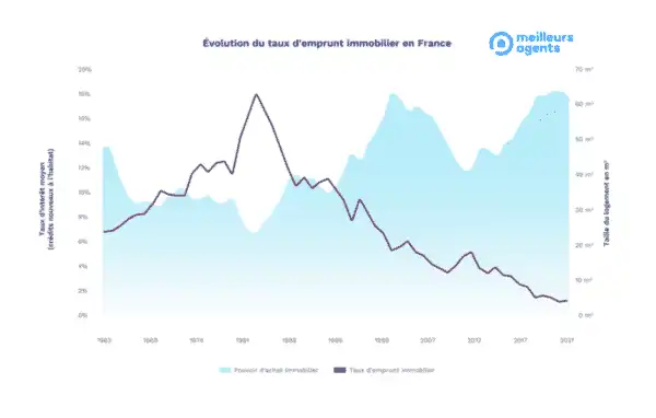 1982 reached a gloomy record low for the purchasing power of French households, it was the lowest level in the Fifth Republic (only 24 m2!), While the nominal interest rate broke its highest historical record, at 18% (as a result of the 2 oil shocks and the resulting high inflation).