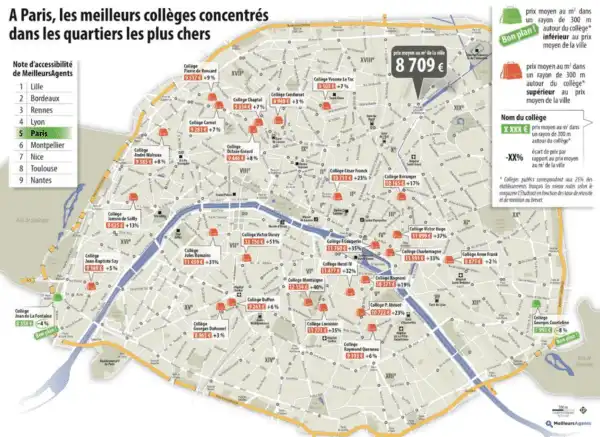 When deciding where to live in a city, what sort of things play a role in the decision? Nearby schools are undoubtedly near the top of the list for those with children and a study by Meilleursagents shows that you will pay on average 17% more for a property within a few minutes walk of one of Paris’ best schools.