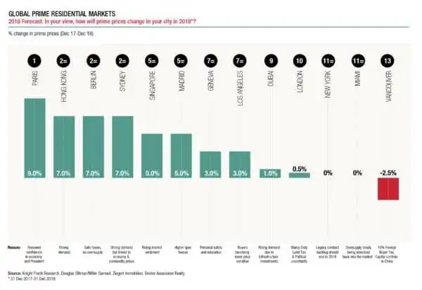 According to Knight Frank’s Annual Prime International Residential Index (PIRI 100), which tracks and predicts price changes in major global prime residential markets, Paris is predicted to outperform 12 other major international cities with a price growth of 9.0% expected for 2018.