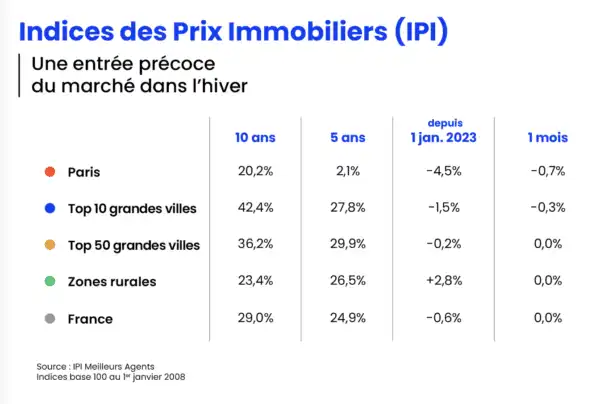 The price decline that commenced several months ago persists in the French real estate market, casting a shadow over the prospect of improvement. Recent data indicates a year-on-year decrease of 0.7% across France, with the Top 10 cities experiencing a more pronounced decline at -1.9%. Only rural areas have managed to defy this trend, clinging to a modest 2.2% increase over the past year. Yet, the vigour that characterized this market segment since the onset of the COVID-19 pandemic is showing signs of waning, in stark contrast to the robust growth of 10.7% in 2021 and 7.1% in 2022.