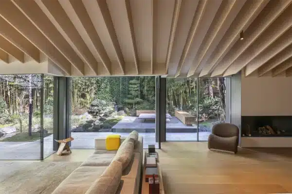 Built around its own interior courtyard, the cedar-clad residence is anchored to nature by landscaped terraces on an authentic Japanese garden with a stone-studded pond stocked with nishiki carp. The original project took about seven years to complete. A redesign by architect Kengo Kuma followed in 2018.