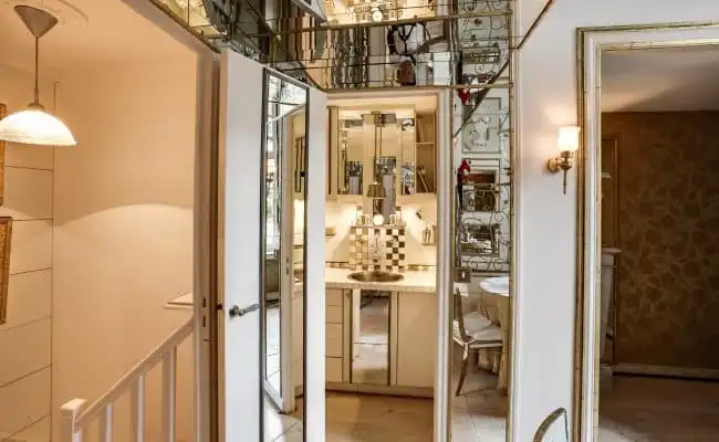 The drawing room French doors open onto discreet terraces within the spacious courtyard garden, adding to the expansive feel of living in the palatial setting of this remarkable residence.  The master bedroom and bath on the upper level are accessed by an open stair with a balcony overlooking the living and dining areas.  The guest bedroom is on the lower level with its own bath and laundry area.  Every part of the property has hidden storage built in so that it is easy to keep everything hidden away, in its own place.  Even the kitchen is in theme, benefitting from elegant touches of silver, gold and mirrors.