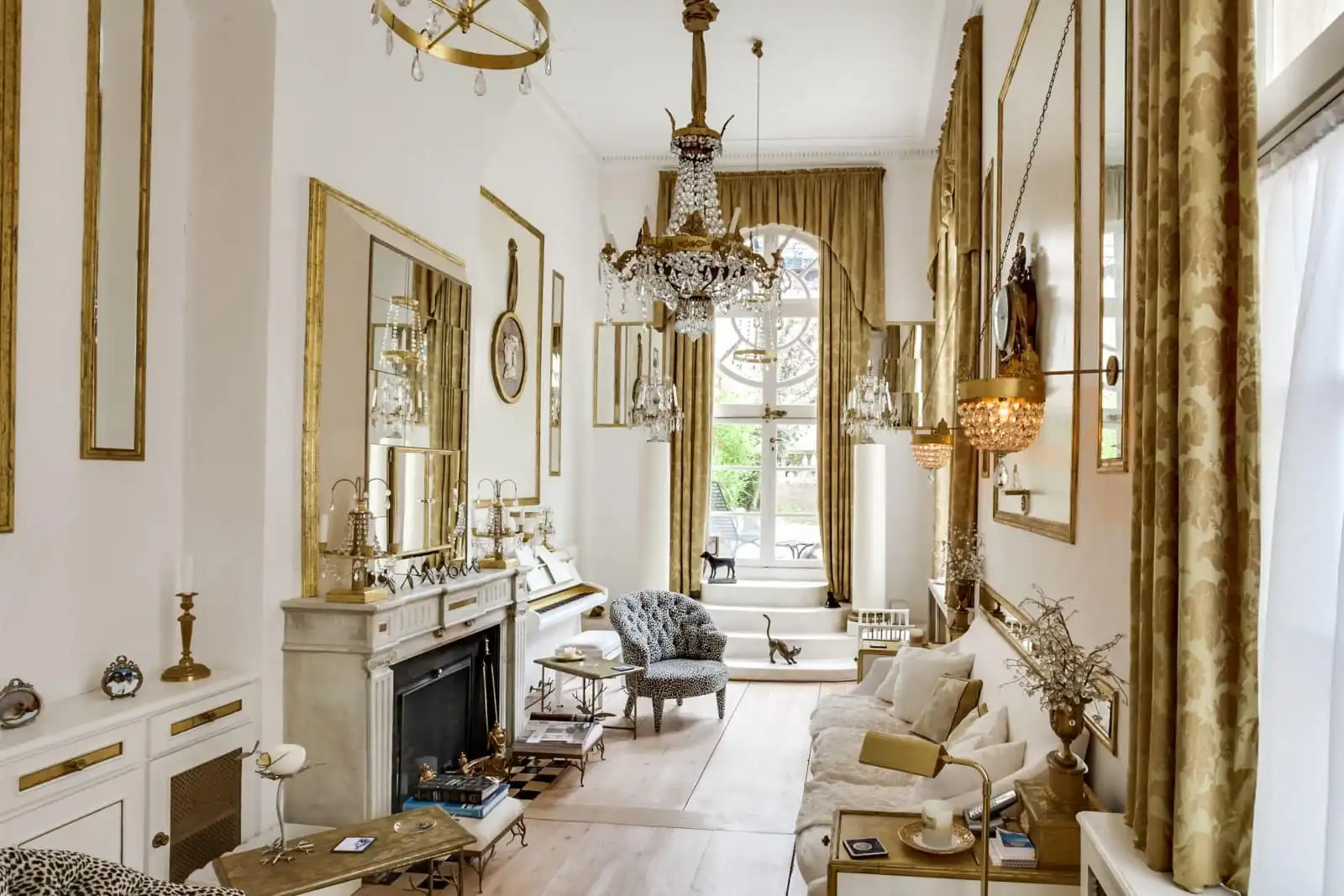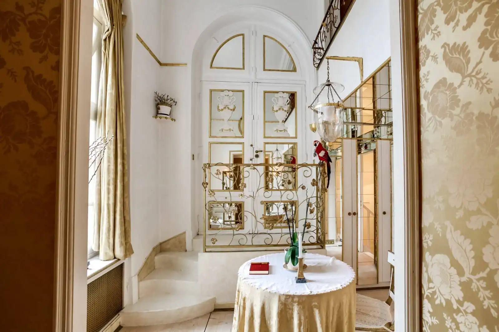 Upon entering the building huge glass doors leading out to the garden dominate the view.  The property itself is a contradiction in terms, being both a bijou residence and yet lavishly appointed in the style of a grand Parisian home. Exceptionally high ceilings and a multitude of magnificent high windows bring light and grandeur.  Mirrored and gold leafed surfaces add to the sense of luxury and space.