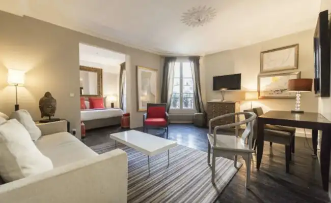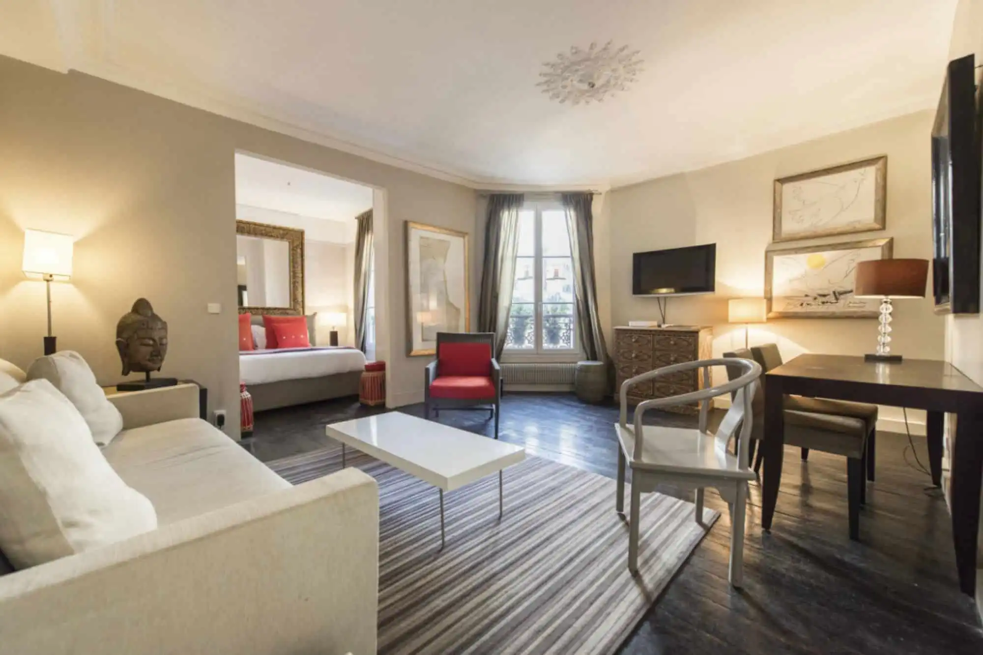 One bedroom, one bath: Beautiful and serene apartment with a view on a quiet, well maintained courtyard. Located on the second floor (with an elevator) near Square du Temple in the heart of the Haute Marais.  This fully renovated, turn-key property measures 42 m2, with a kitchen open to the living area.