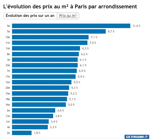 2018 was a record-breaking year for the Parisian real estate market, from all-time high prices to all-time low interest rates.  But where exactly in the capital did the greatest changes take place?  In which arrondissements did price growth increase the most in 2018, and where do they currently stand in terms of price per square meter?  Using statistics provided by MeilleursAgents, Le Figaro Immobilier compiled a comprehensive summary of these trends.