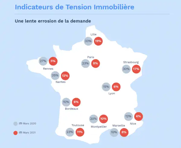 Strasbourg or Lille, for example, had 33% and 30% more buyers than sellers, respectively. As for Rennes, Nantes, Toulouse, Paris and Montpellier, their ITI exceeded The Meilleurs Agents Barometer analysis of real estate prices | N ° 133 | March 2021 over 20%. Even Bordeaux and Marseille, where demand had weakened in recent years, had at that time experienced a resurgence of interest (10% more buyers than sellers).