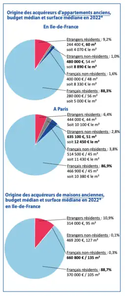 Twenty years ago, French residents accounted for 91.5% of home buyers in the Paris Region. This proportion has been eroding over the years, and by 2022 it will have dropped to 88.4%. They buy slightly more expensive properties (€310,000) than foreigners in France (€270,000), but less than all those living outside France, whether foreign (€478,400) or French (€411,300).