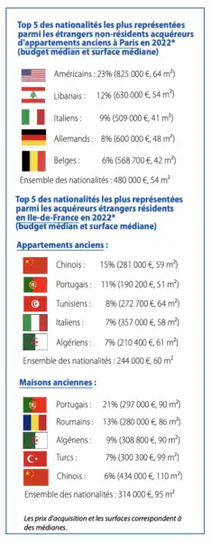 Among non-French resident apartment buyers, the Chinese were the most represented in 2022 (15%), followed by the Portuguese (11%), Tunisians (8%), Italians and Algerians (7%), Moroccans (6%) and Romanians (5%). Italians have a higher median budget of more than €350,000, due to the large number of purchases in Paris. At the other end of the price range, Portuguese and Romanians buy apartments for less than €200,000.