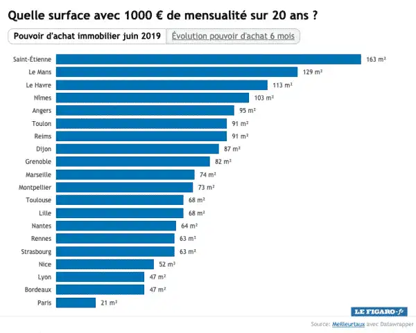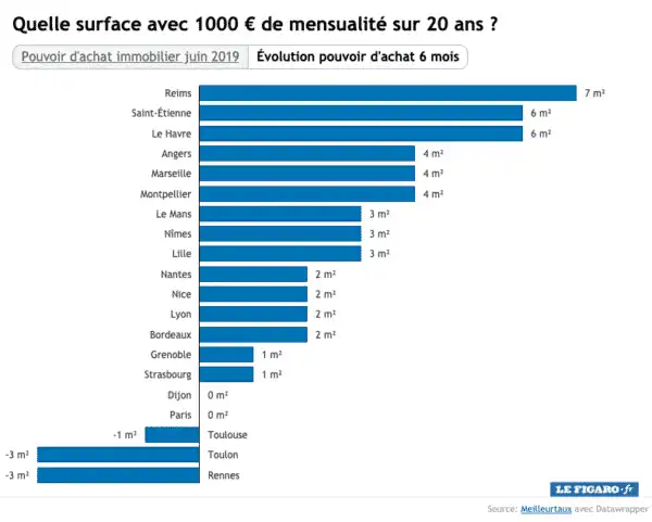 The situation is even more apparent in medium-sized cities where prices are falling (Mulhouse, Le Mans, Clermont-Ferrand…). As a result, cities such as Reims, Saint-Étienne and Le Havre have witnessed purchasing power increases between 6 and 7 m², about the same size as a large kitchen. “Today, the balance (between price increases and interest rate decreases) is good,” says Jean-Marc Torrollion, President of the Fnaim, “but it seems that the ‘rate effect’ has reached its limit.  Let’s hope the ‘price effect’ does not take over”. This could weaken household creditworthiness.