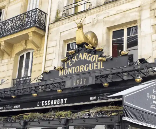 It is without a doubt the most original sign on the street! L’Escargot de Montorgueil opened in 1832 to specialize in Burgundian cuisine and snail dishes. Having preserved its superb sign in the shape of a large golden snail, this restaurant also contains a magnificent decoration: its ceiling by Georges Clairin, adorned the living room of the divine Sarah Bernhardt.