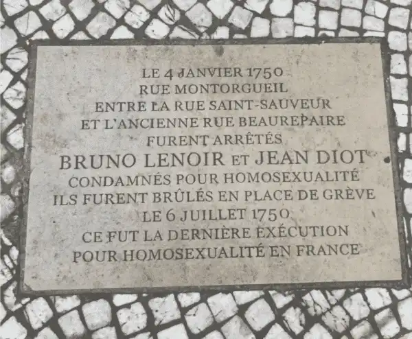 If you are one of those people who walk down the street with your head down, you may have already noticed this plaque , located at the intersection between rue Montorgueil and rue Bachaumont. It testifies to a historical event that sends shivers down your spine: on January 4, 1750, two men named Jean Diot and Bruno Lenoir, aged 40 and 21, were surprised: “ in an indecent posture and in a reprehensible manner. »