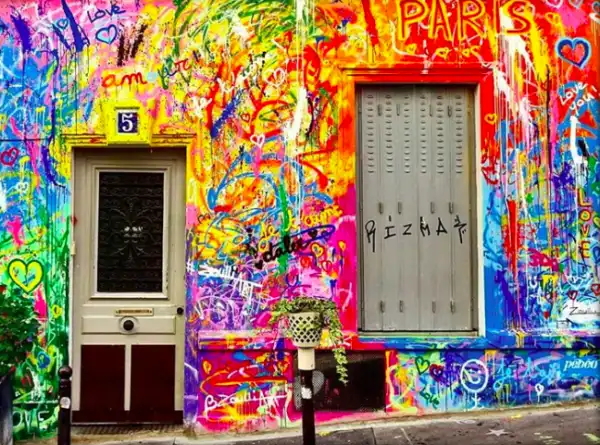 5 rue Androuet was the canvas for street artist Zouillart, who loves to juxtapose bright colors.  The pink, blue, green, yellow, and red that magnificently pop against pale neighboring buildings all invite passersby to do one thing: take photos!