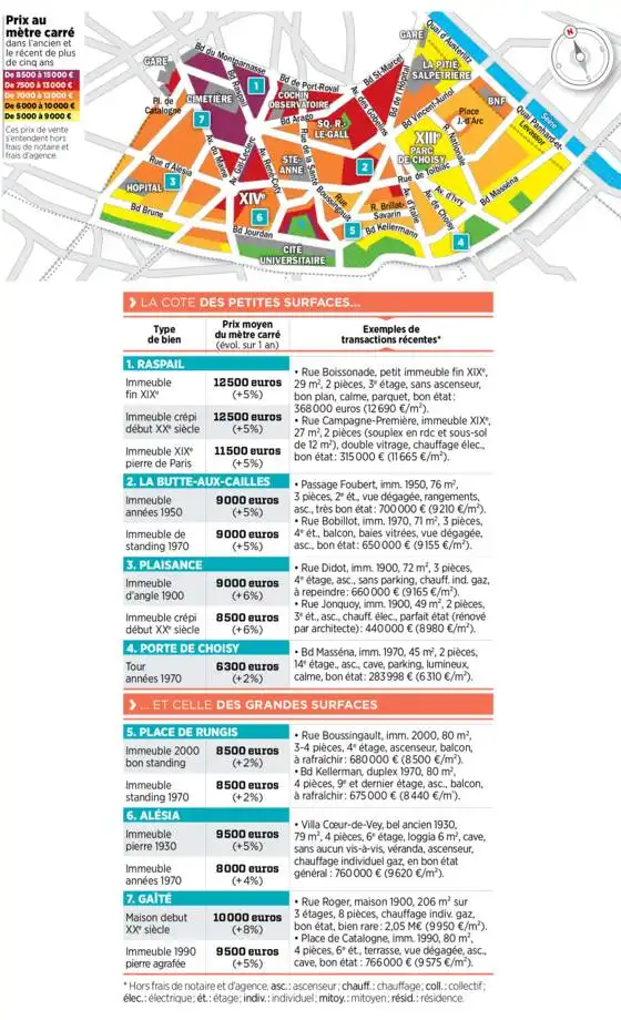 In the thirteenth, prices near la Butte-aux-Cailles continue to climb. A two-room apartment at 29 square meters yielded exactly 10,000 euros per square meter. However, rue Tolbiac has proven itself a kind of border, with prices around 9,000 euros per square meter to the north of this street, and 8,500 euros to the south, towards la place de Rungis. This southern zone, as well as Maisons-Blanche, boasts much investment potential with the future southern extension of the Line 14.