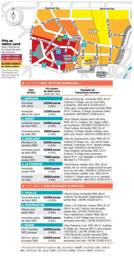The strongest growth is in the Jules-Joffrin sector, near the town hall (rues Sainte-Isaure, du Poteau, etc.), where the square meter stands at 9,400 euros. On rue Ferdinand-Flocon, a three-room apartment of 52 square meters in perfect condition went for 515,000 euros (9,905 euros per square meter). Inflation has also been noted around la rue de l’Olive, where prices have been negotiated at 9,000 euros per square meter, that is, 1,000 euros more than last year. As for the Boulevard Barbès, it now exceeds its own bar of 8,000 euros per square meter. In this area, a young couple bought an apartment at 80 square meters in perfect condition within a building dating from the 1910s, for 670,000 euros (8,375 euros per square meter).