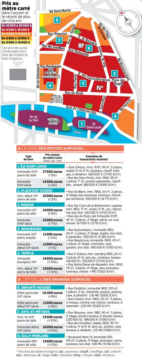 In the 4th, family estates of 70 to 120 square meters are nabbed almost immediately, at prices almost always higher than 15,000 euros per square meter. A 93 square meter property on rue du Bourg-Tibourg with a balcony and herringbone parquet flooring, on the fourth floor of a building with an elevator, was sold 1.565 million euros (16,830 euros per square meter). As far as large, family-sized apartments are concerned, they require a budget higher than 2 million euros, and are monopolized by foreign customers.