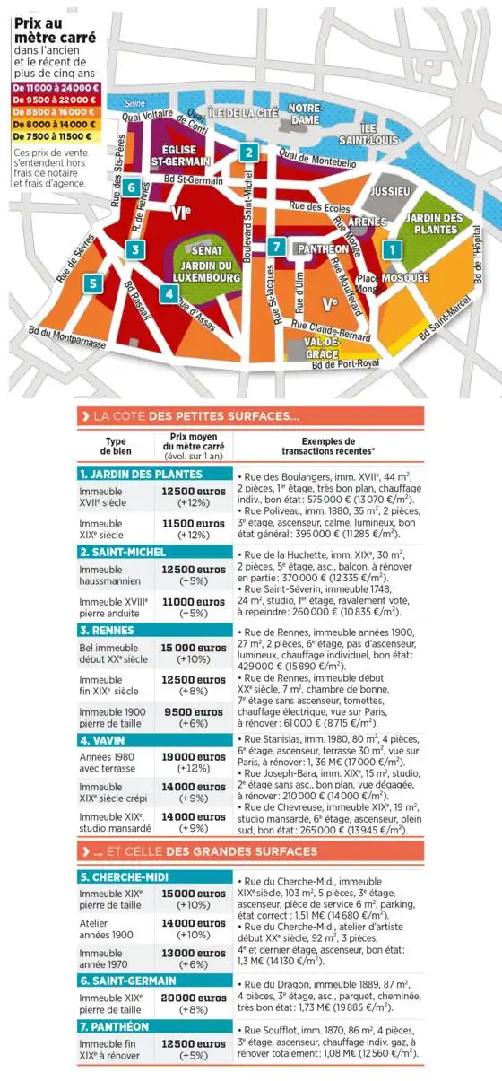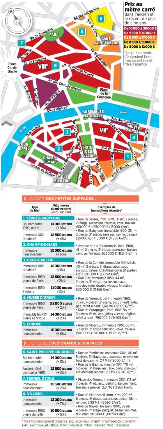 Strong inflation has also been recorded in the 6th (up 8%). Although truly exceptional properties or those with a view are worth up to 20,000 euros per square meter, the same doesn’t necessarily ring true for the so-called belles addresses. On rue de Sevres, a space of 123 square meters, in good condition within building built in the 70s, has thus cost 1.68 million euros (13,660 euros per square meter). Foreign customers, from the United States and South America, are active in this area, aiming for pied-a-terres at about 70 to 80 square meters.