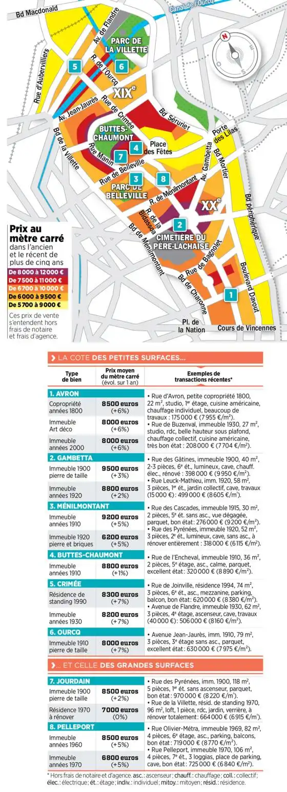 Although inflation is high in the twentieth arrondissement (up from 5 to 10%), demand is mostly concentrated on two and three-room apartments. Between Jourdain and Gambetta the price per square meter is around 9,000 euros, while towards the heights of Ménilmontant it’s at about 8,000 euros. Case in point: two different two-bedroom apartments, one at 54 square meters on rue de Ménilmontant and the other at 52 square meters on rue de Pixérécourt, selling for 436,000 and 425,000 euros respectively.