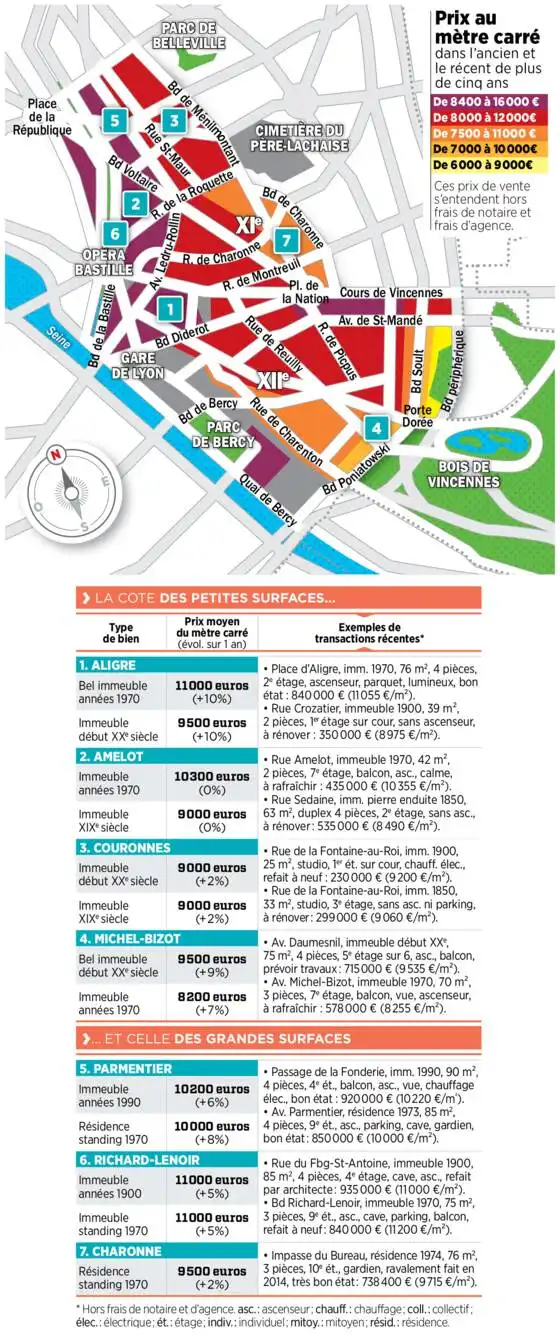 To live in a space at less than 10,000 euros per square meter in the 11th, buyers have to accept some shortcomings. For example a south-facing three-room apartment at 59 square meters, with elevator, cost only 561,750 euros, or 9,520 euros per square meter, but is located on the very noisy rue Oberkampf. Other sectors remain promising, such as the top of rue Jean-Pierre-Timbaud, where a more affluent clientele is moving in.