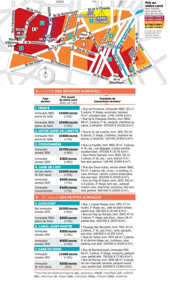 In a building from the 1800s on rue de Trévise, a four-room apartment at 93 square meters, in good condition and with great amenities, sold for 1.05 million euros (11,290 euros per square meter). Towards Poissonnière, properties are also appreciating substantially. Only in the northeastern area, between la rue du Delta and Barbès-Rochechouart, are there properties under the 10,000 euro mark. Like a studio of 28 square meters in a condo built in 1977, that sold for 277,000 euros (9,895 euros per square meter).