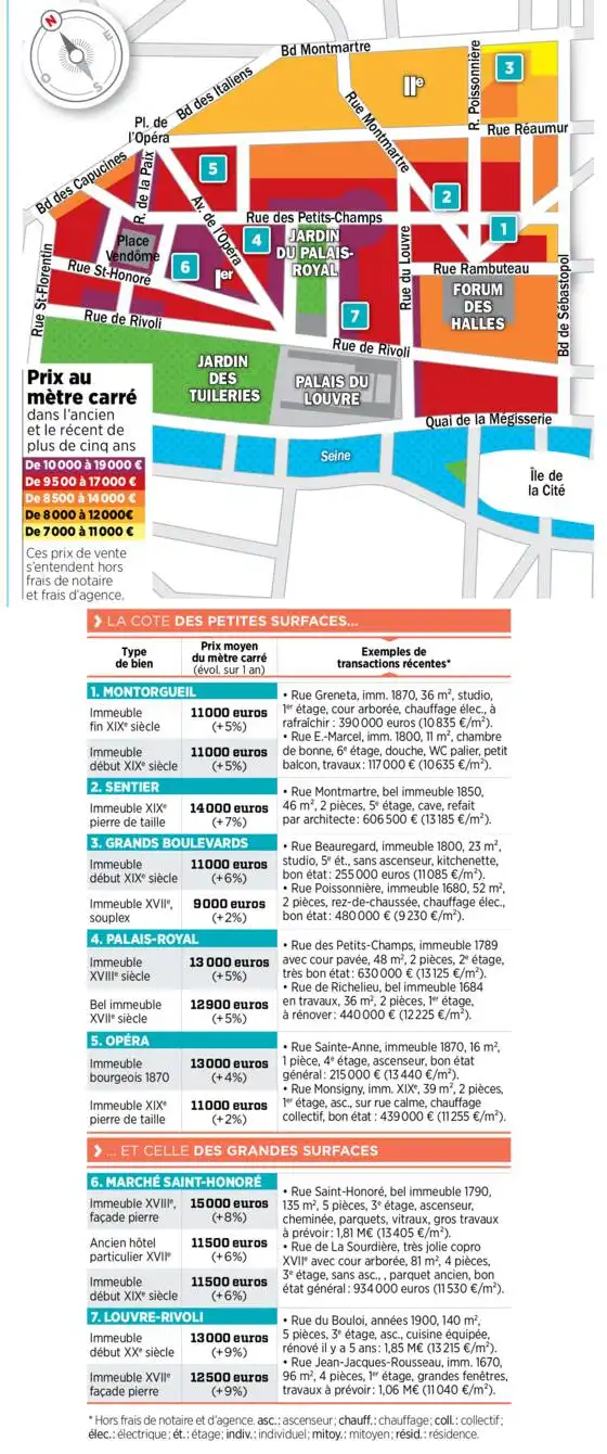 The situation is also changing north of these central sectors. Rue Montmartre and rue Poissonnière, where neighboring textile shops and condominiums have not yet been renovated, have good potential, even if some exceptions have been noted. Take the example of two different three-bedroom apartments on rue Montmartre: the first apartment, 73 meters squared with a rooftop view, in a building with an elevator, went for 82,000 euros (11,290 euros per meter squared). However, the second apartment, a duplex-style space of 69 square meters with a terrace, in a building without an elevator, sold for 1.17 million euros (nearly 17,000 euros per square meter). Another area that should appreciate: rue du Louvre. After the renovation of the Forum des Halles, the future Fondation Pinault will make it a really upscale neighborhood.