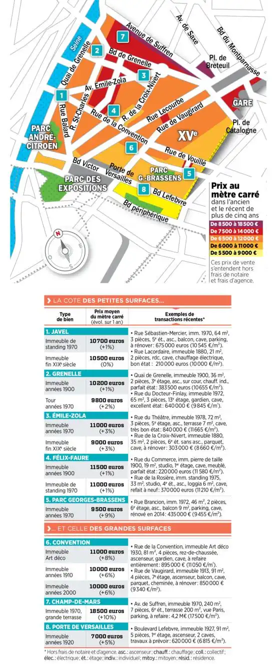 In this arrondissement, we see contrasting evolutions. After a strong rise (up 25% in three years), the Balard and Beaugrenelle sectors, competing with prices in the southern 16th arrondissement and Issy-les-Moulineaux, are at a standstill. “In Grenelle and Javel, even the cost of properties greater than 1 million euros has begun to decline. On the other hand, in the center of the arrondissement, inflation has reached 5%. Although the noisy rue du Commerce is less popular, families turn to parc Georges-Brassens, where the square meter for large, multi-room apartments is at 8,000 euros. Case in point: A 117 square meter apartment on rue Labrouste, with multiple large balconies, negotiated at 935,900 euros in all.