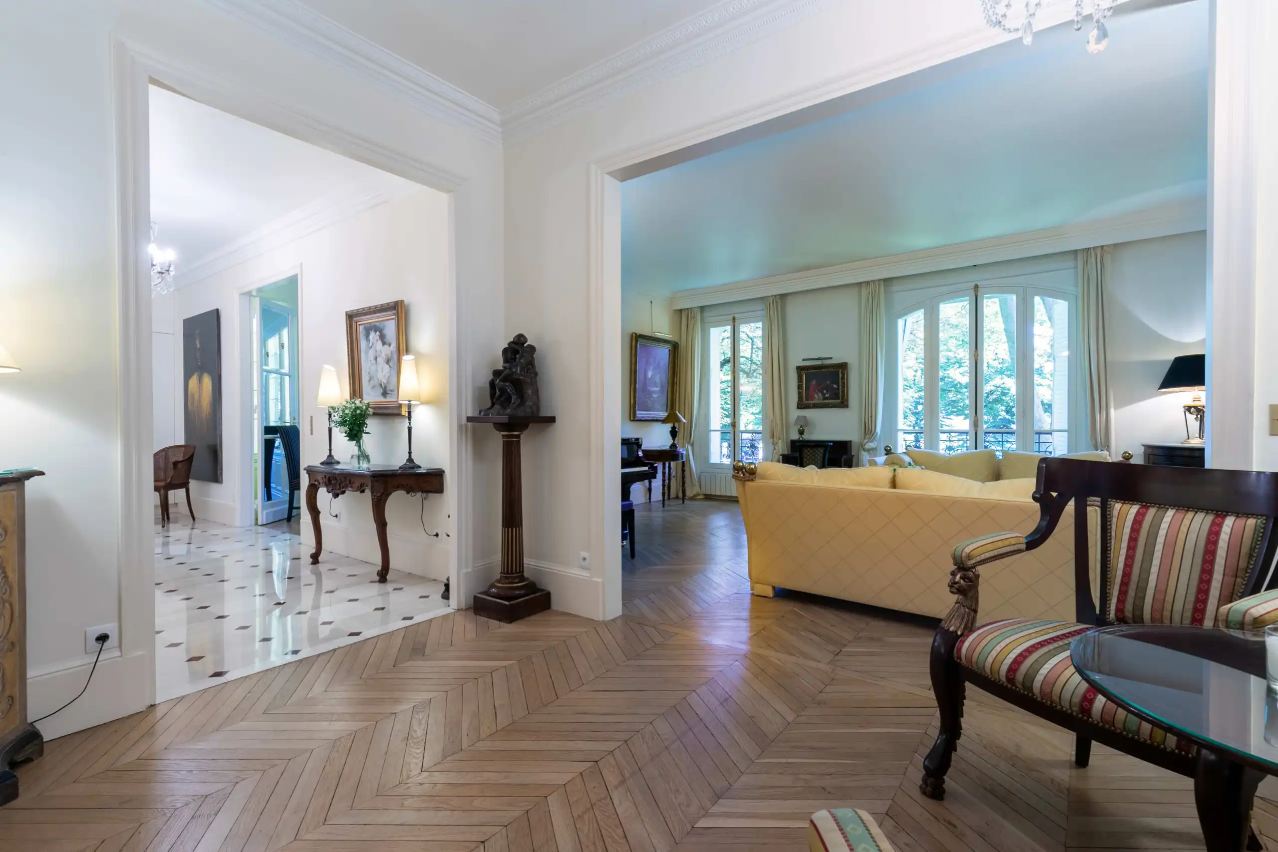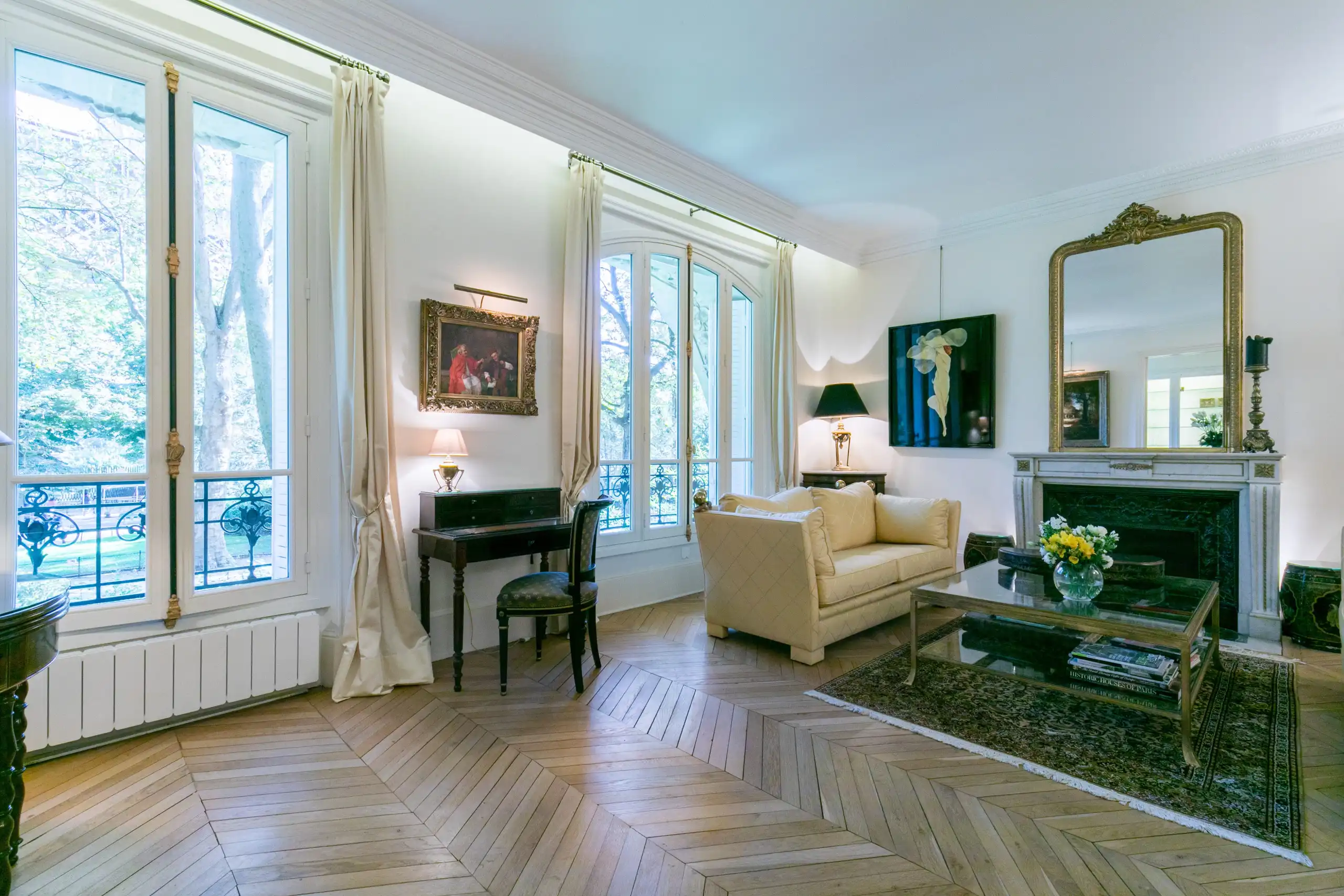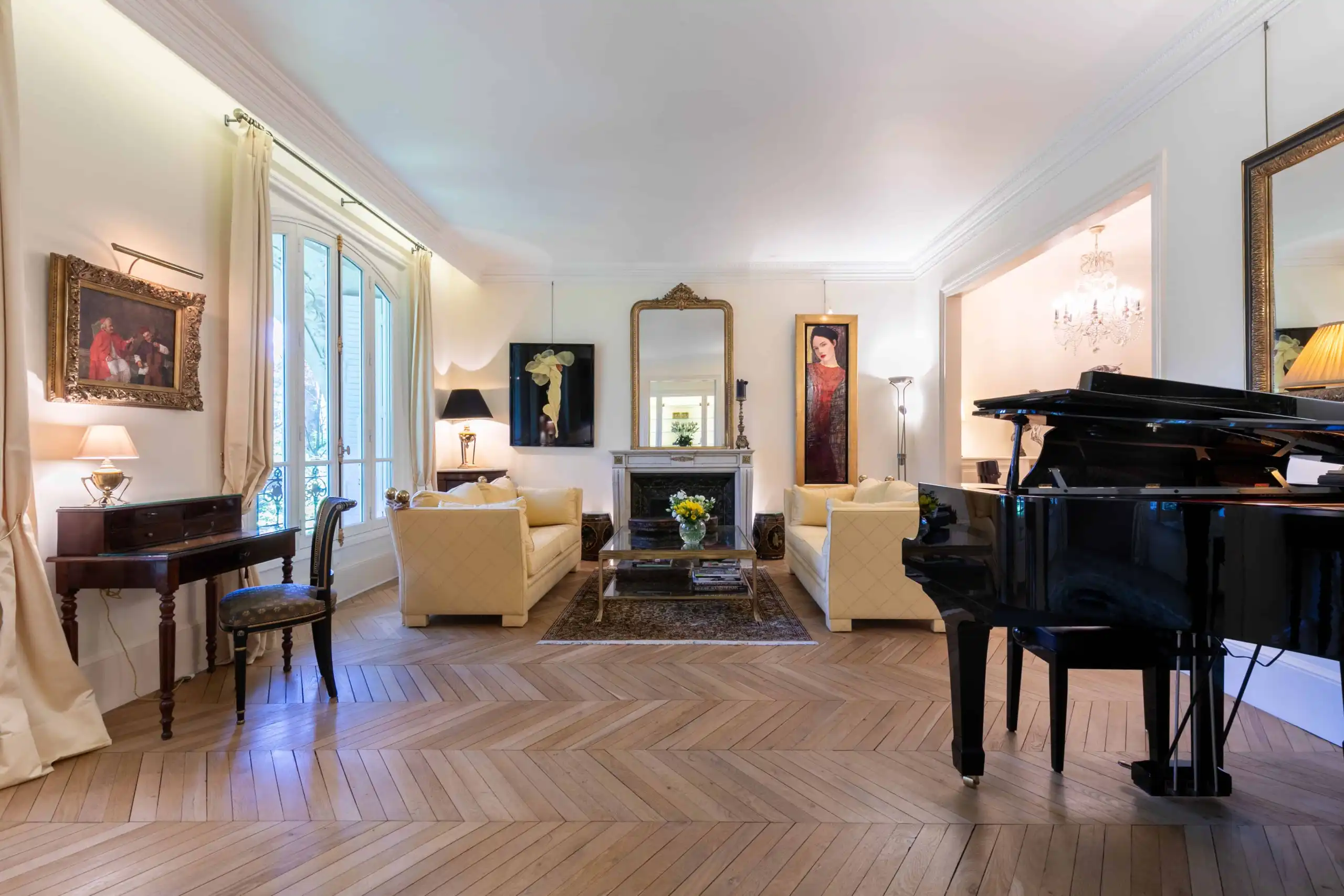 This superb apartment is on the first floor (second floor American) of a fine turn-of-the-century stone building with a caretaker and an elevator / lift located directly on the Champ-de-Mars.