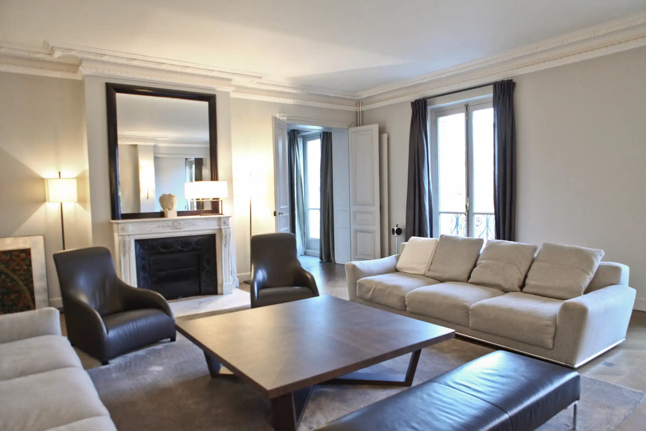 This sophisticated 5 bedroom, 4 bath 400 m2 residence, in pristine condition, lies at the edge of Parc Monceau in the 8th, overlooking the leafy park with its ornate gates, as well as the Arc de Triomphe a short distance away down the avenue. It’s an elegant address that is both quiet and centrally located.