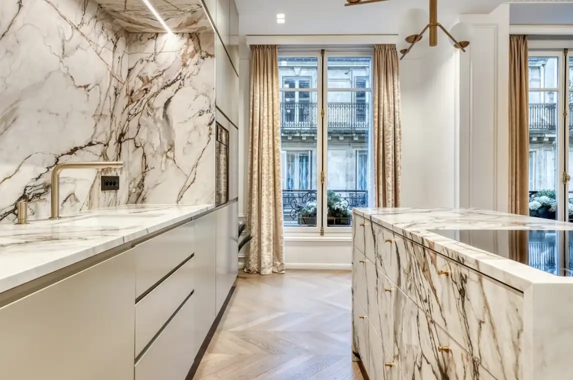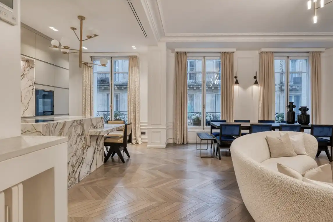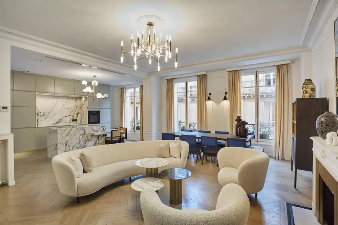 Upon entering the apartment through a discreet vestibule, the original parquet flooring, completely restored and refined in color, unifies all the rooms, setting the stage for the luxurious living space within. The vast reception room serves as the heart of the home, boasting a traditional white marble fireplace, brass embellished ironwork, and mirrored glass, all complemented by three large, full-height windows that flood the space with natural light. With a ceiling height of over 3m20 (approx. 10 feet) and an area of approximately 52m² (560 square feet), the reception room seamlessly integrates a kitchen-dining area, a dining area, and a lounge area, adorned with custom-made seating in burnished wood and plush fabric.
