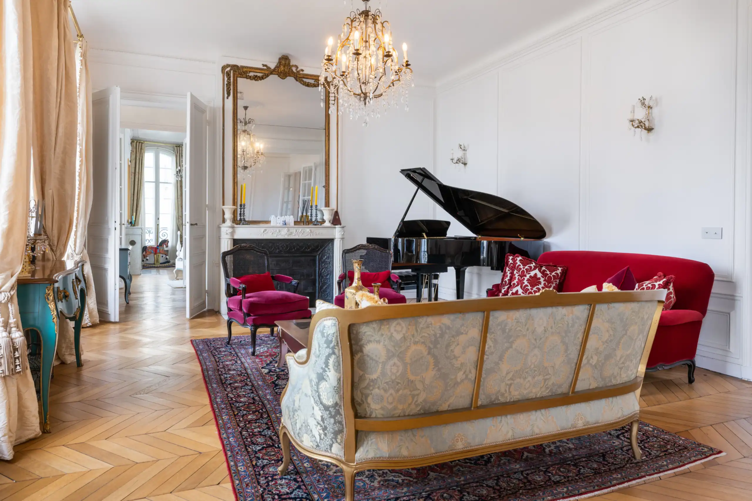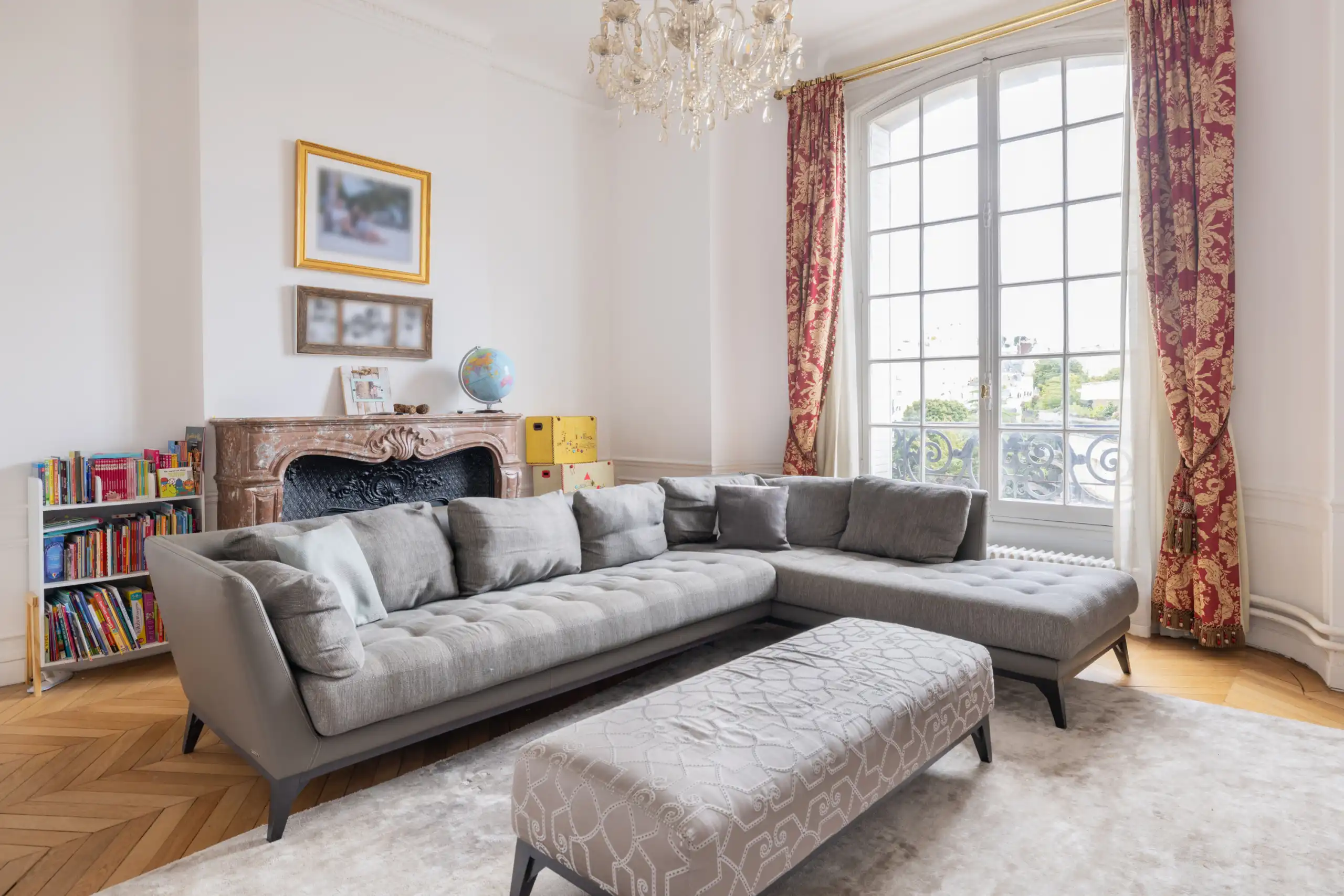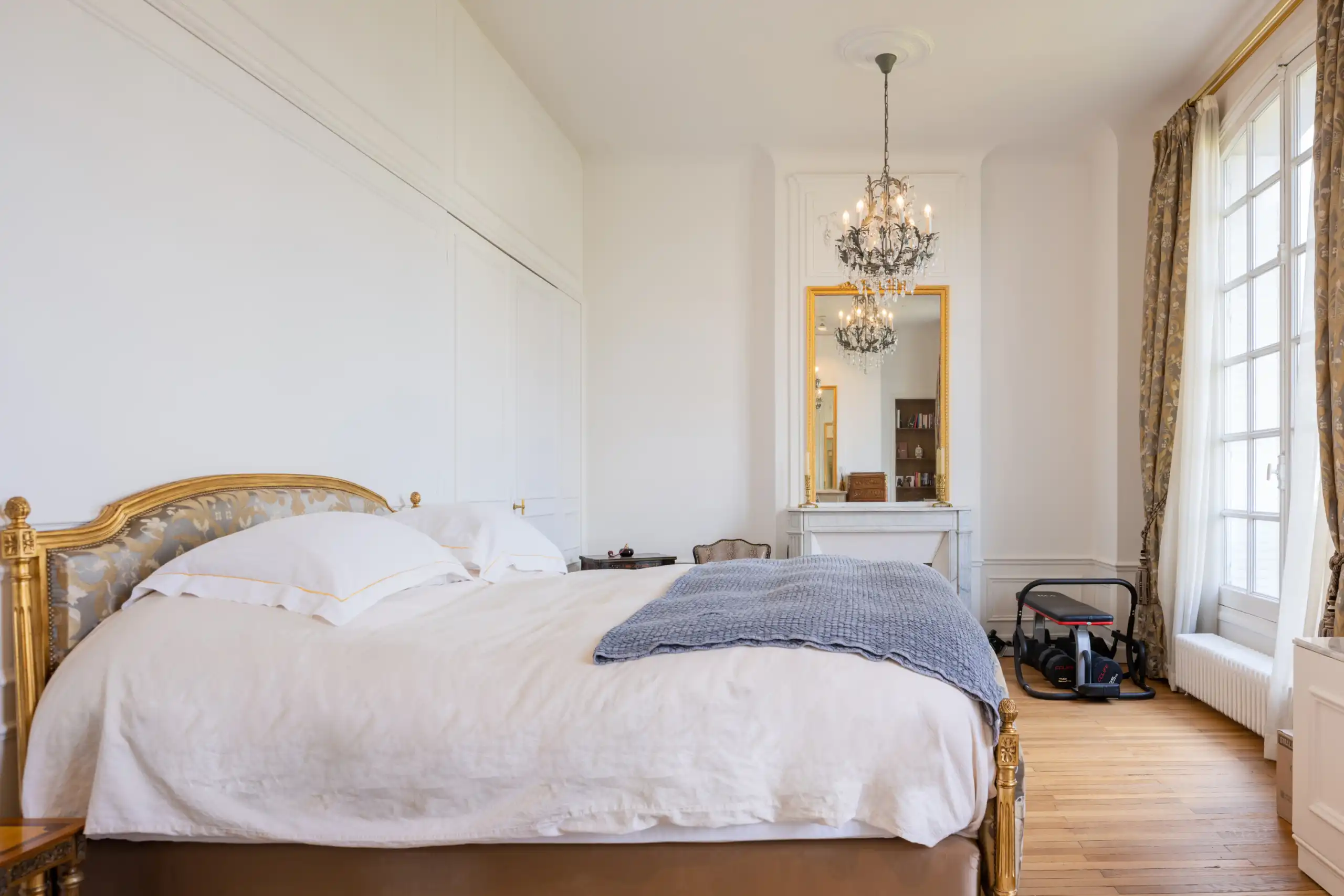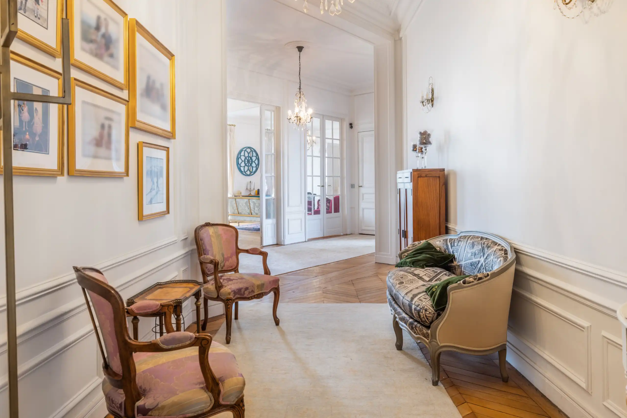This recently renovated 235 m² (2529 ft²) family apartment on the fourth floor is a palatial space that exudes timeless elegance mixing seamlessly with modern comforts. Efficiently designed, the grand entry hall is at the center and leads to all the main rooms in the home. The original crown moldings on ceilings that are an exceptional 3.5 meters (11.5 feet) high, harmonize gracefully with herringbone floors, period chandeliers and marble fireplace in the elegant oversized reception room and separate large family room. Refined and spacious bedroom suites are each outfitted with its own updated and luxurious full bathroom and walk in closets.The kitchen is vast and modern, with white finishes and high-end stainless steel appliances. Stunning and open Paris views from every room are the finishing touch in this majestic home.