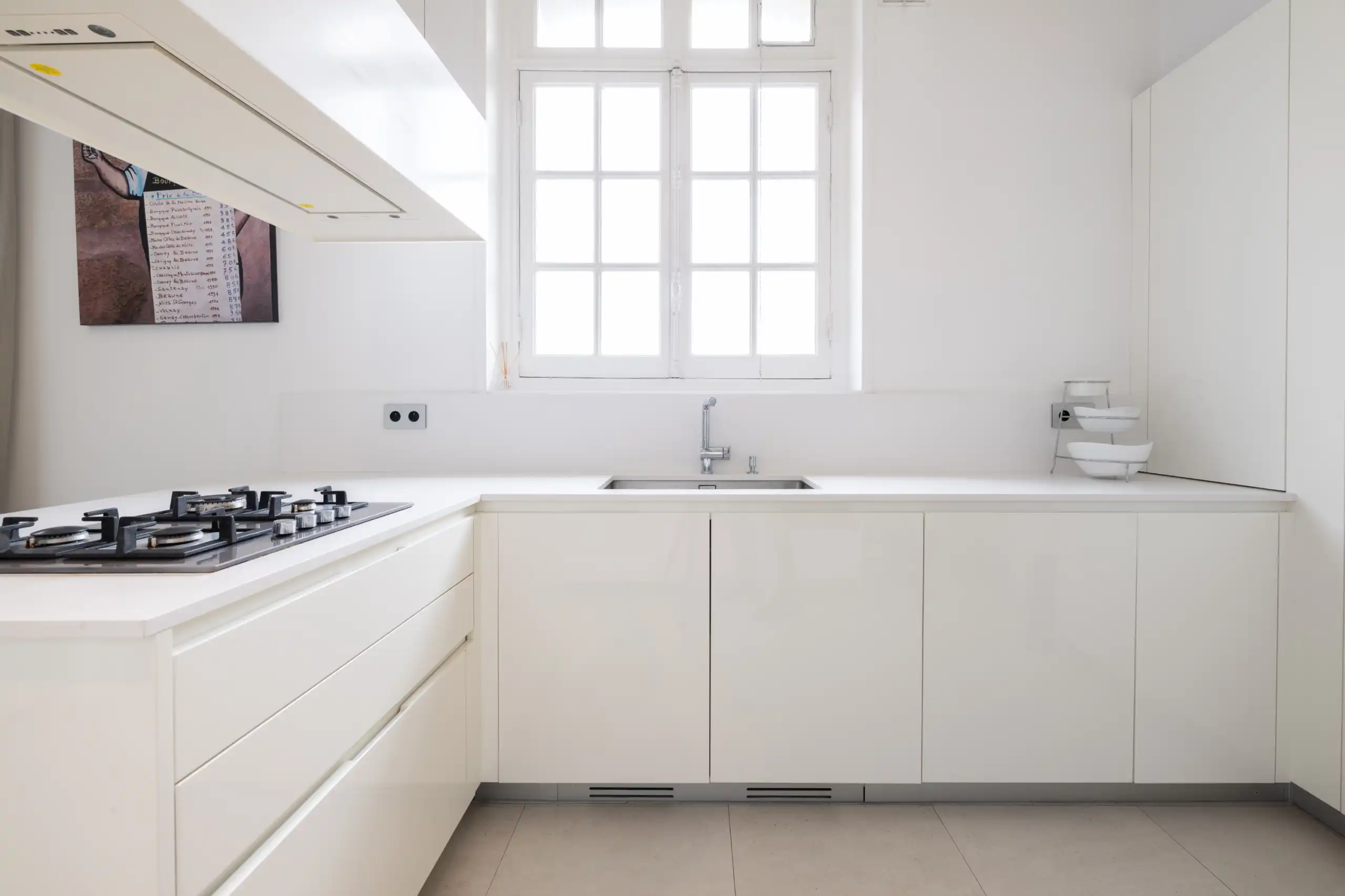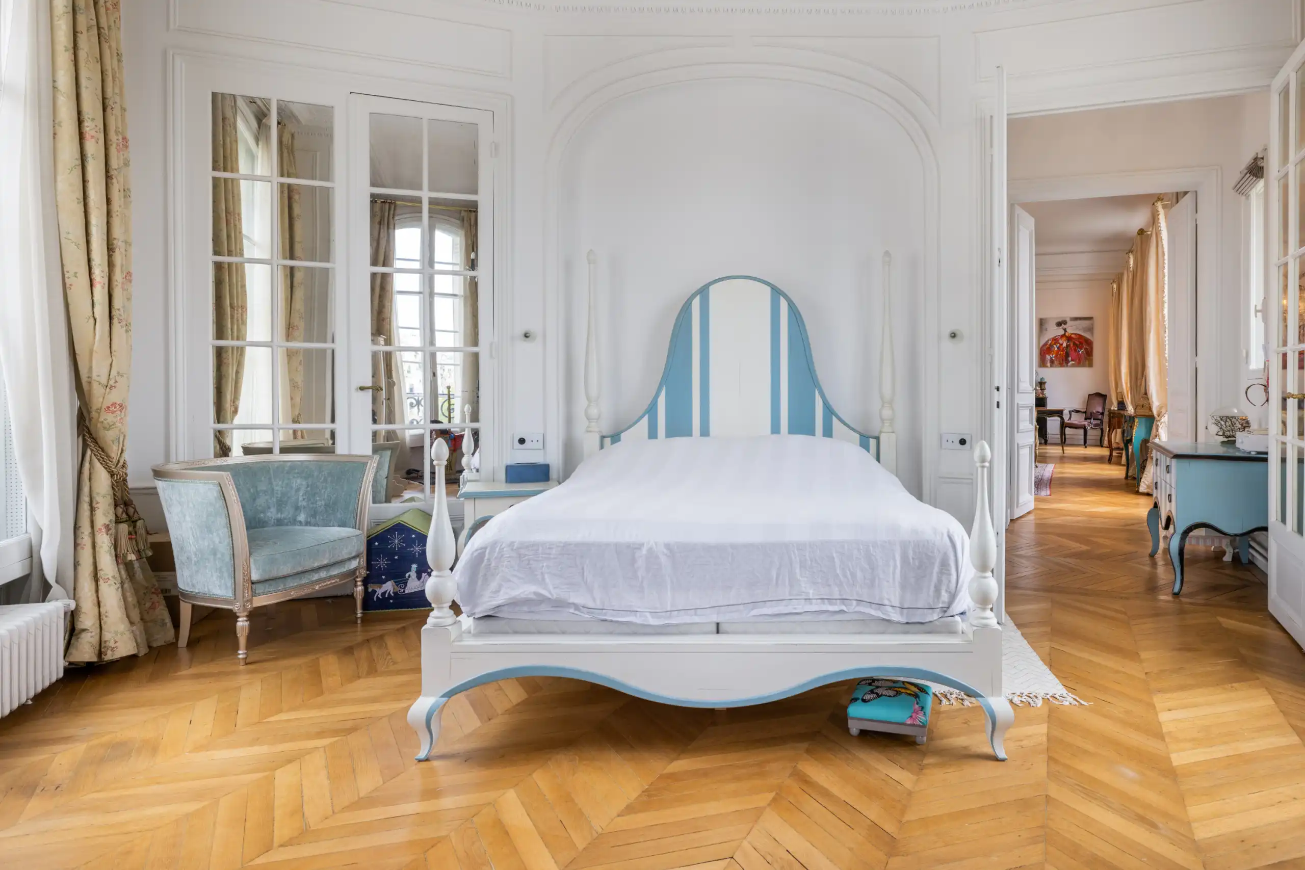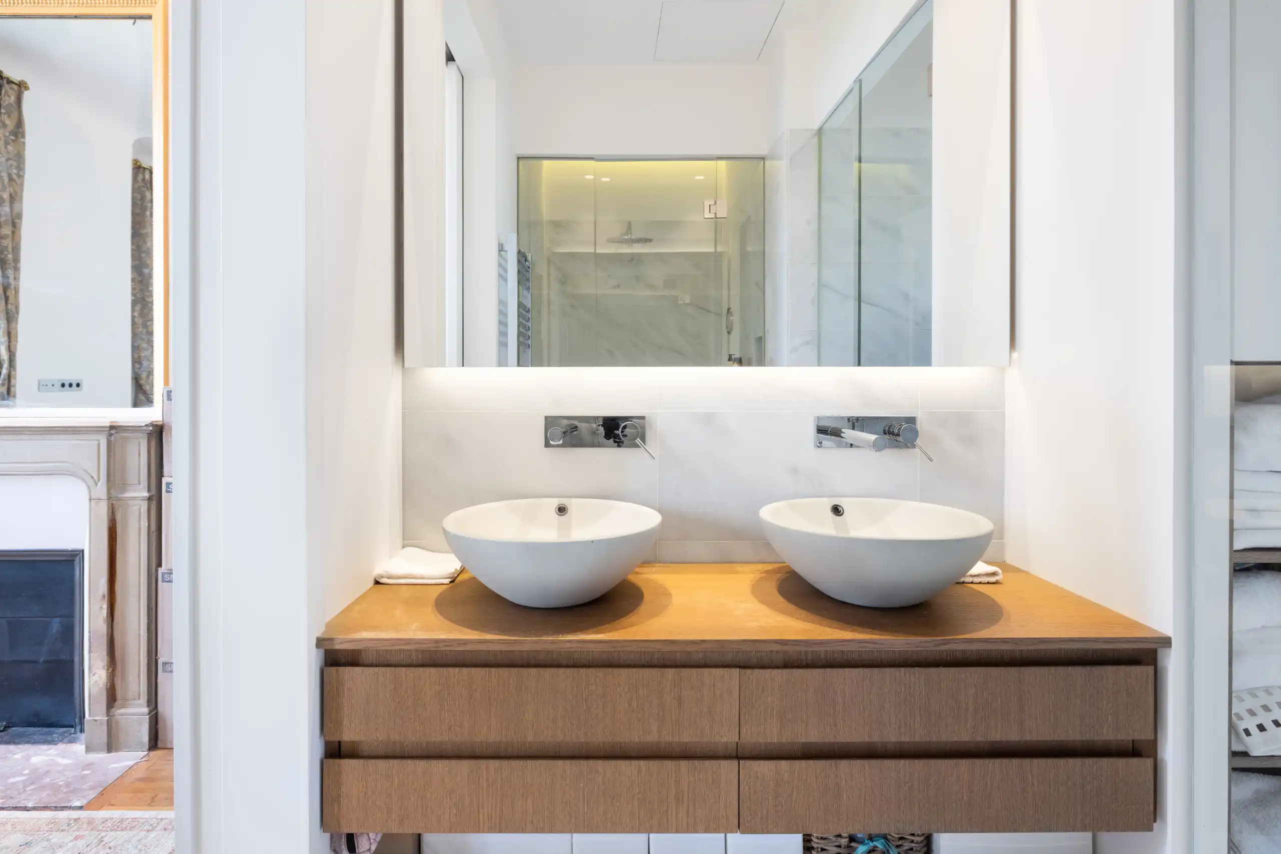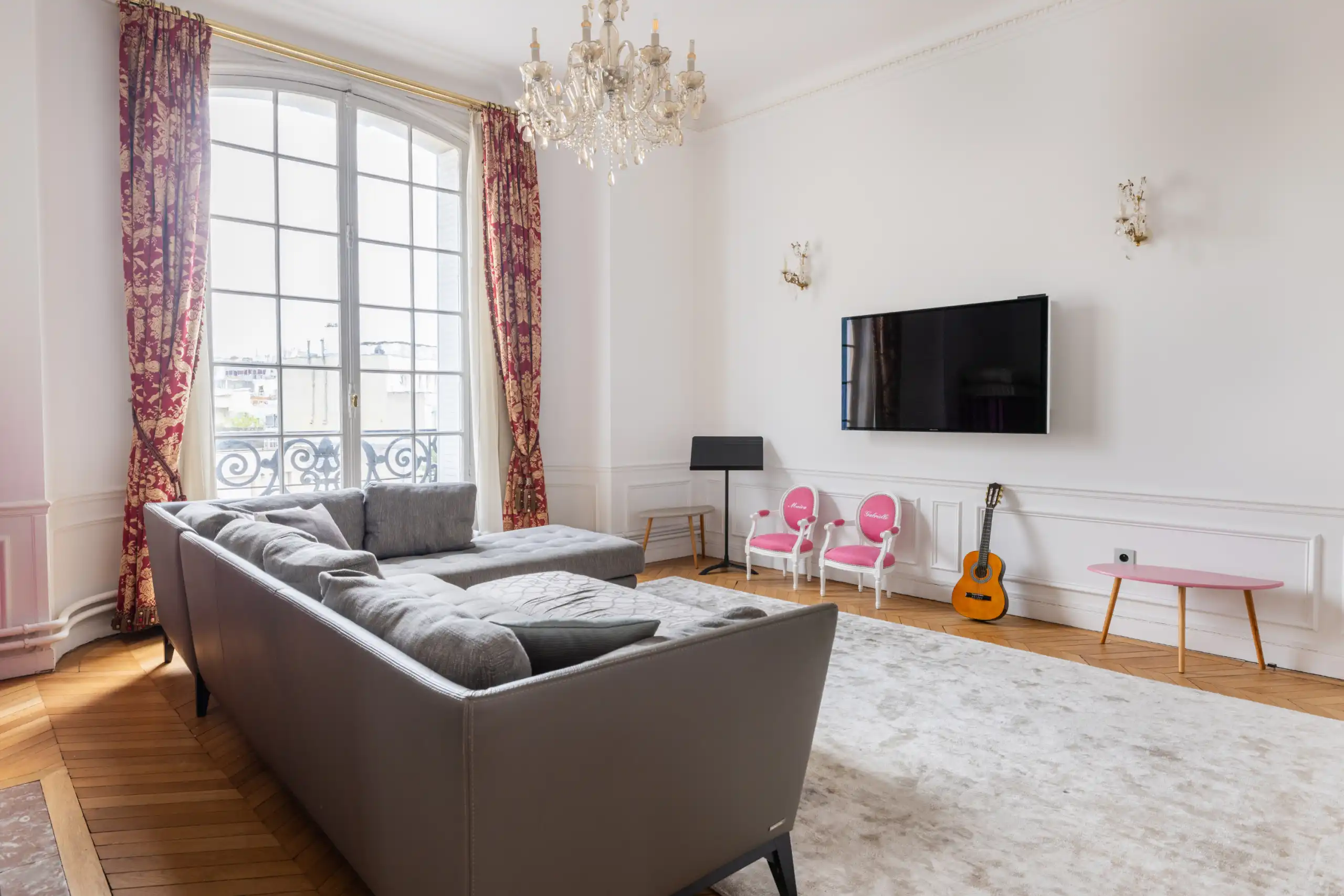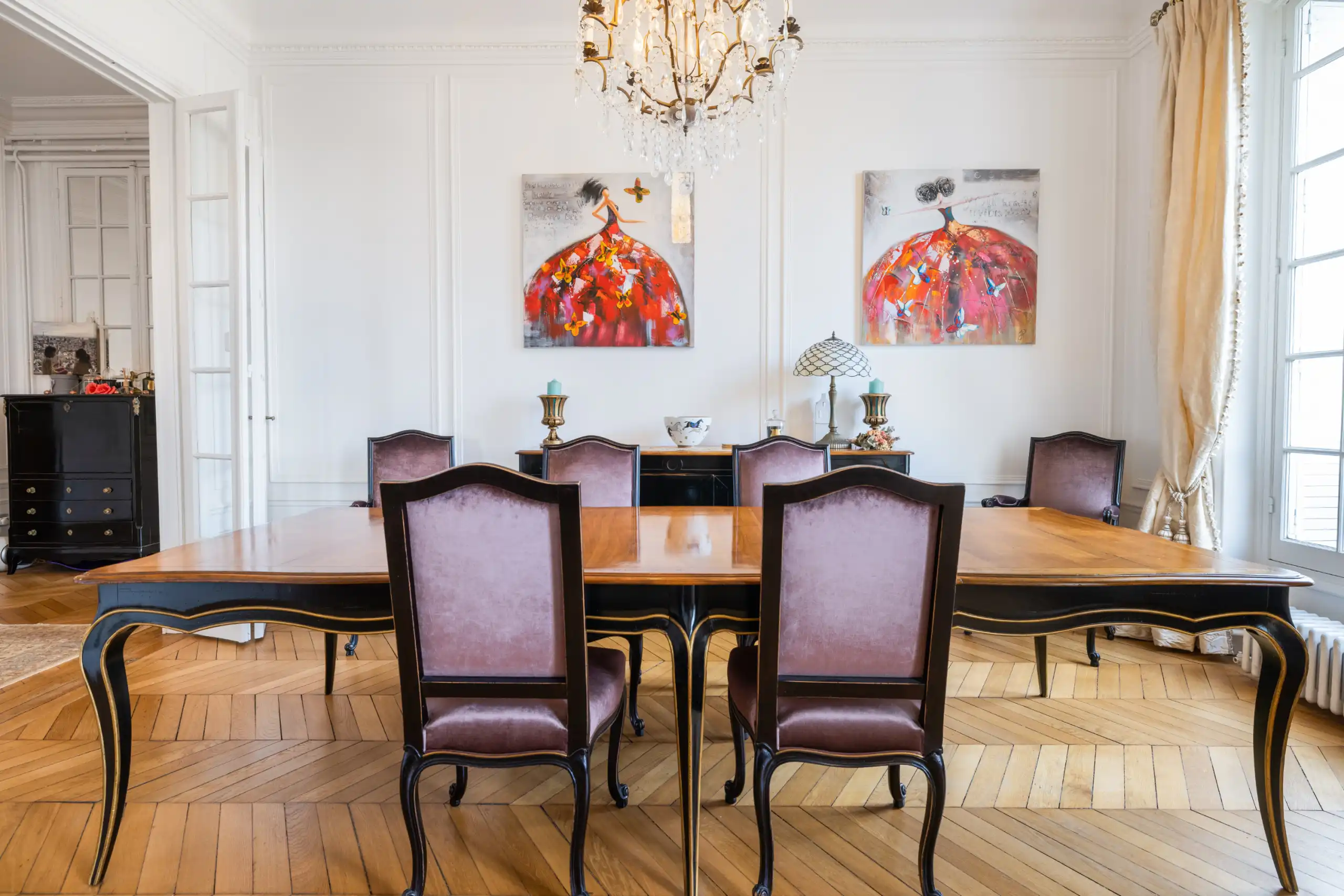 This recently renovated 235 m² (2529 ft²) family apartment on the fourth floor is a palatial space that exudes timeless elegance mixing seamlessly with modern comforts. Efficiently designed, the grand entry hall is at the center and leads to all the main rooms in the home. The original crown moldings on ceilings that are an exceptional 3.5 meters (11.5 feet) high, harmonize gracefully with herringbone floors, period chandeliers and marble fireplace in the elegant oversized reception room and separate large family room. Refined and spacious bedroom suites are each outfitted with its own updated and luxurious full bathroom and walk in closets.The kitchen is vast and modern, with white finishes and high-end stainless steel appliances. Stunning and open Paris views from every room are the finishing touch in this majestic home.