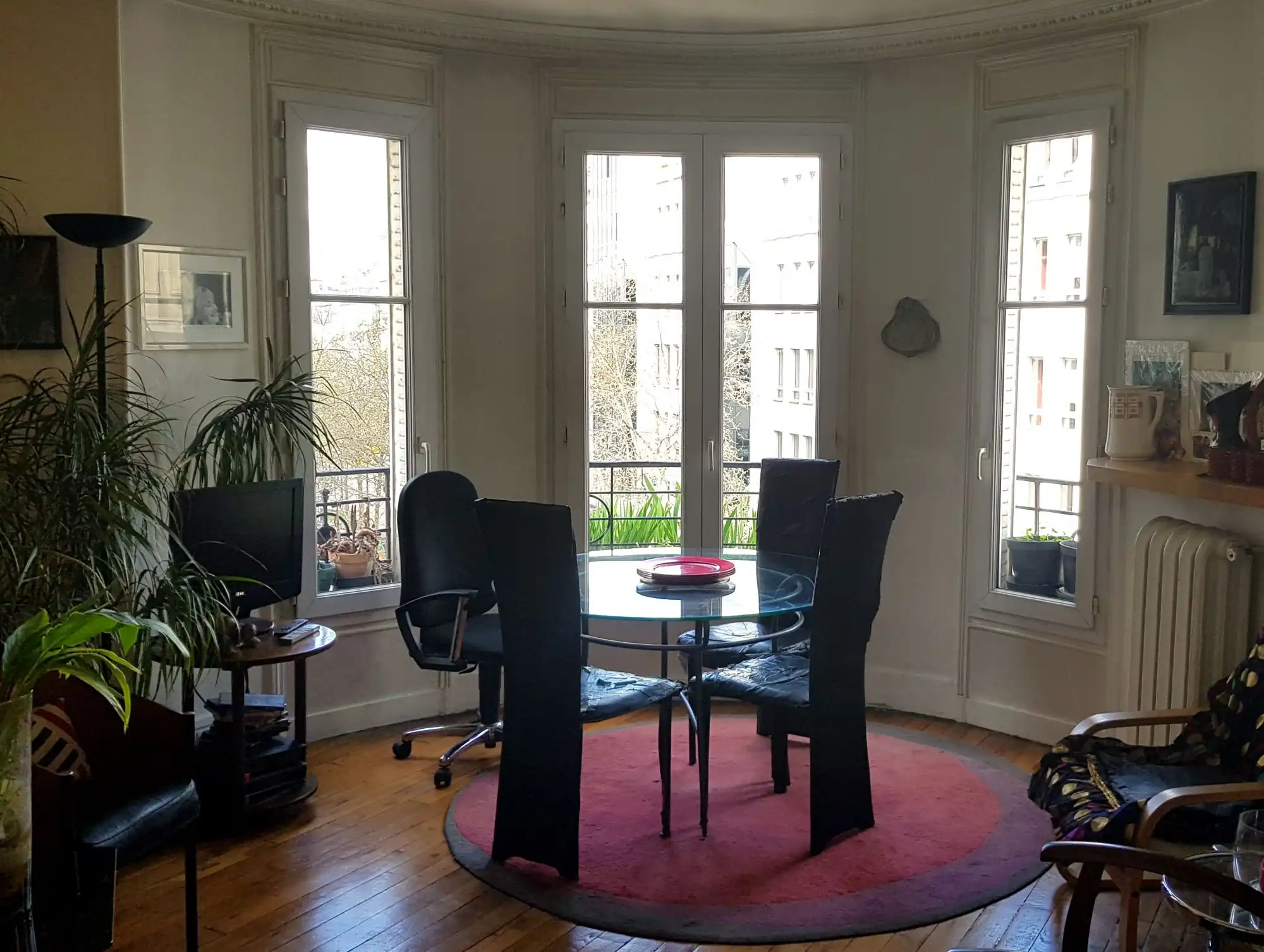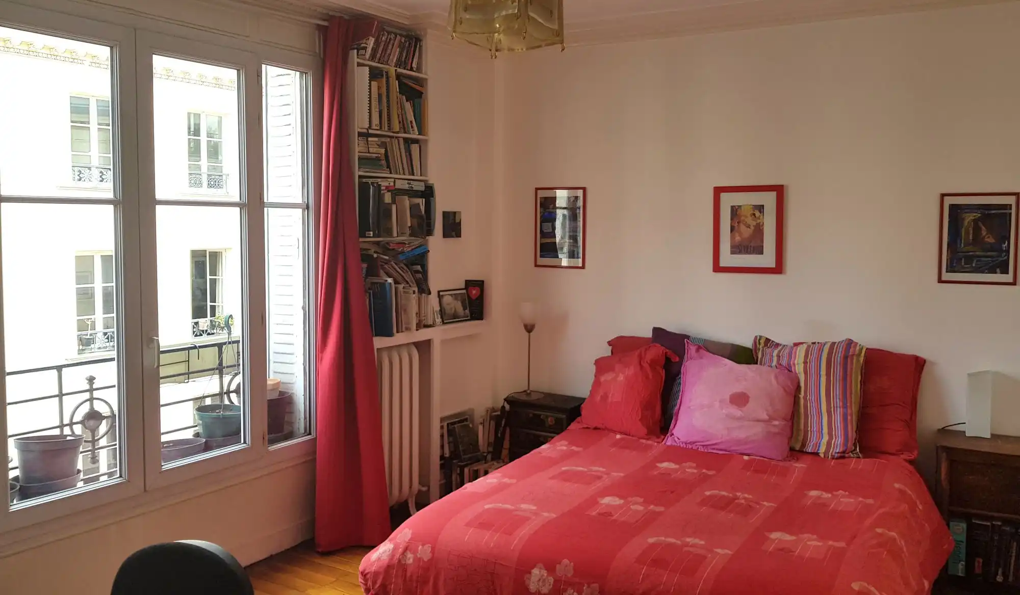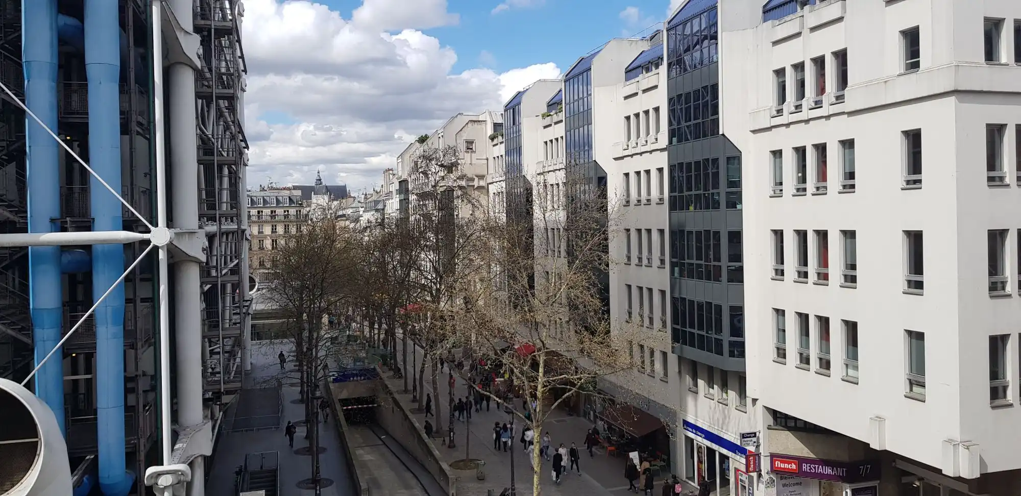 1 bedroom, 1 bath: Luminous 42m2, 4th floor property (with elevator). The living room / dining room features three large windows with open views on the open space surrounding Pompidou in the Marais. The kitchen is open to the living area; a separate bedroom and bath complete the property. Some refreshing of the property is in order.