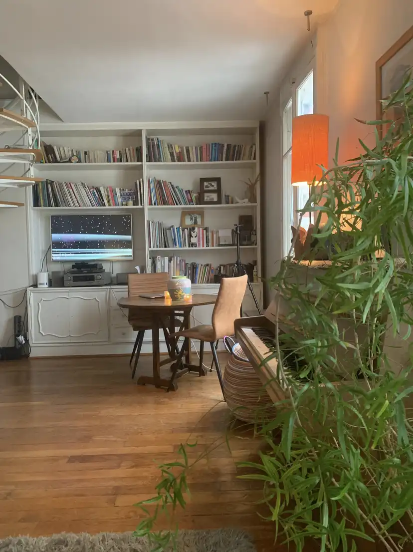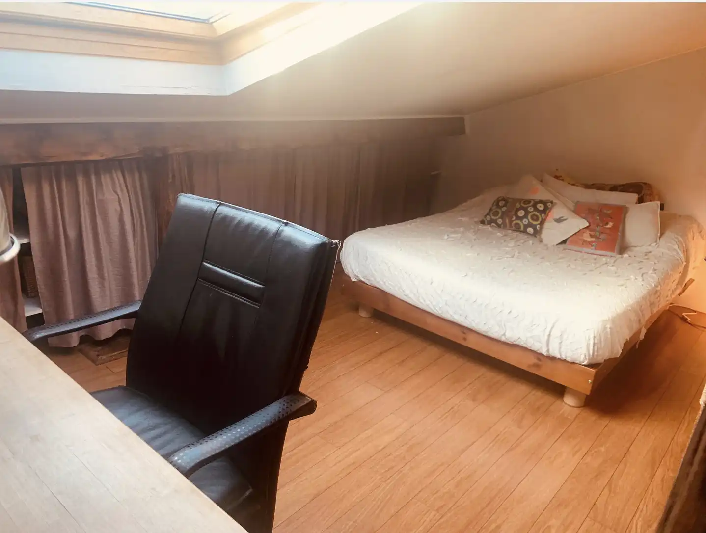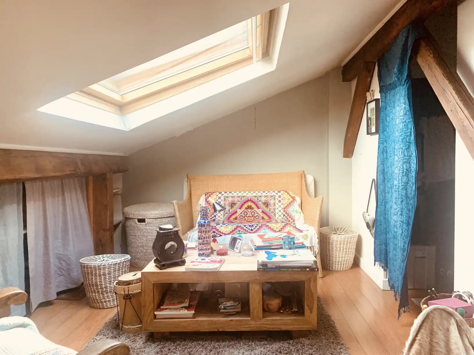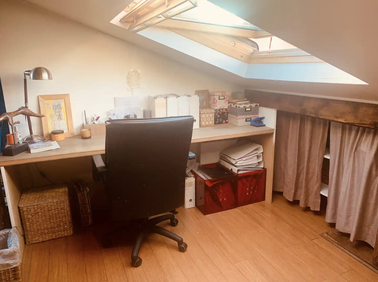 This generously sized apartment features a lot of usable space including two bedrooms a double living / dining room with book cases and two French door windows.  The small co-ownership has just 10 owners.  This duplex apartment is on the 4th and top floor of the building, with it's top level located under the beams of the roof.