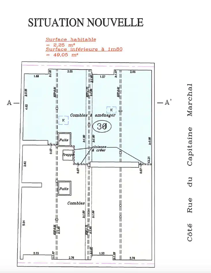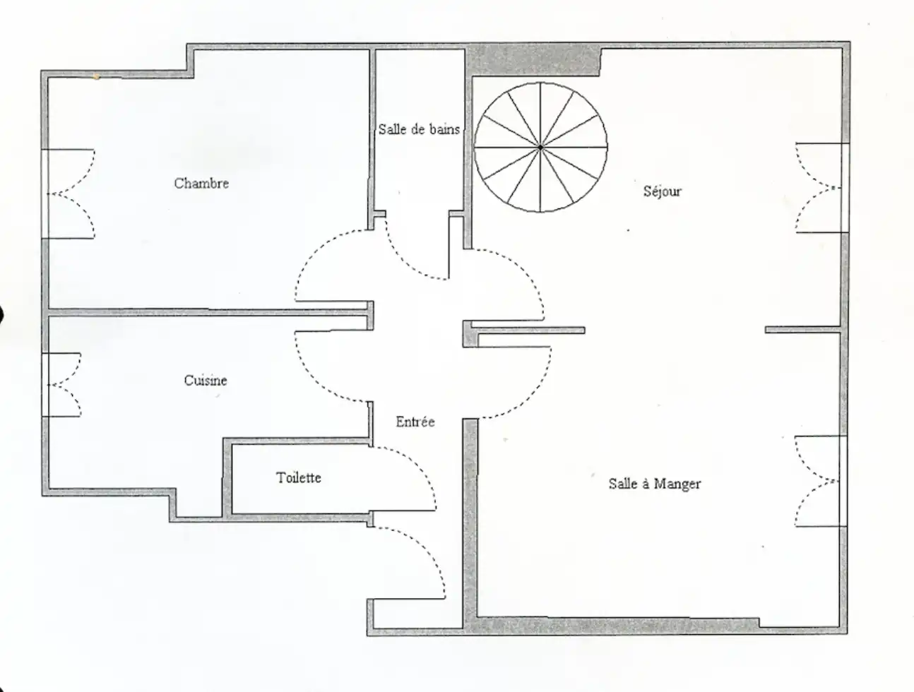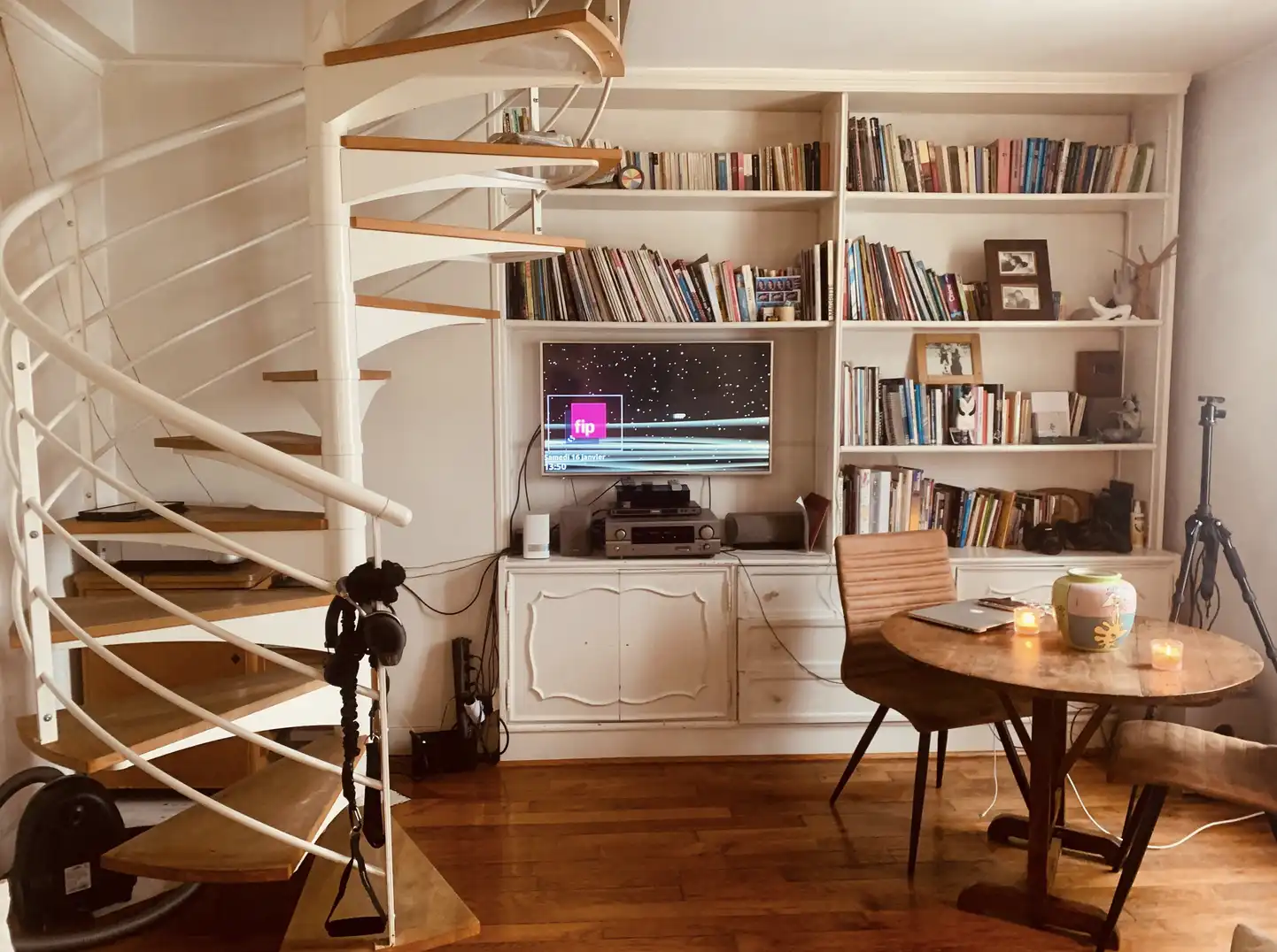 The double living room / dining room has a circular staircase that serves the upper level with it's office and second sleeping area.  This upper level bonus space (37m² au sol) is not counted in the total official space due to its sloping ceiling.