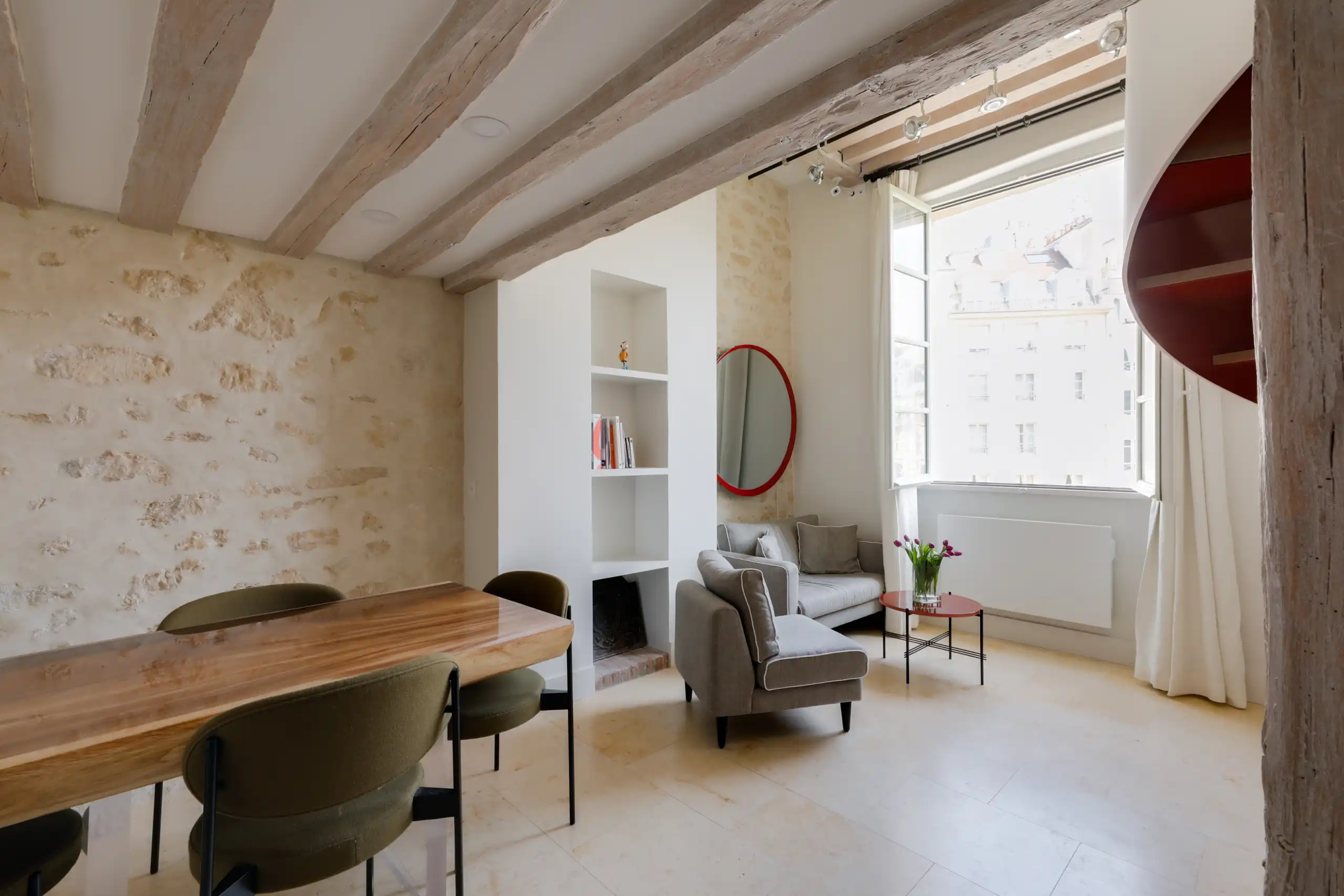 It is hard to believe that this quiet, private place is on an island in the middle of the oldest most historic part of Paris.   The high beamed ceilings and original stone walls tell you you're in a very old, very privileged part of the city.  Built in 1650, this charming building features lovely views over a royal square that is largely unknown by tourists and Parisians alike.