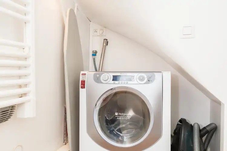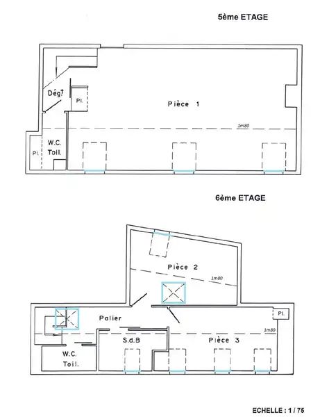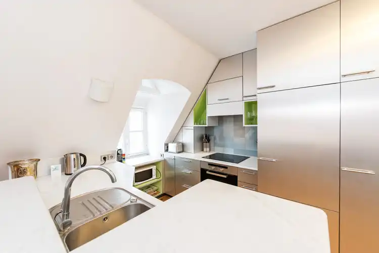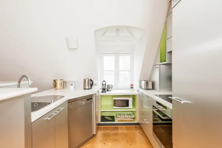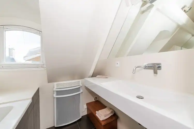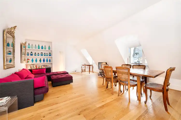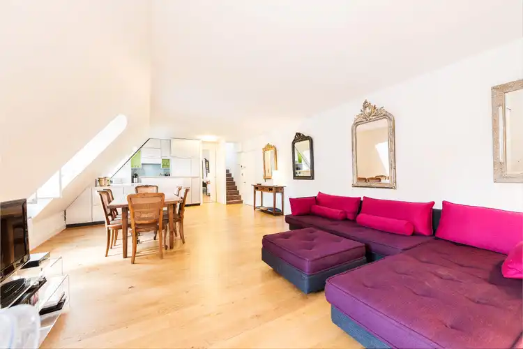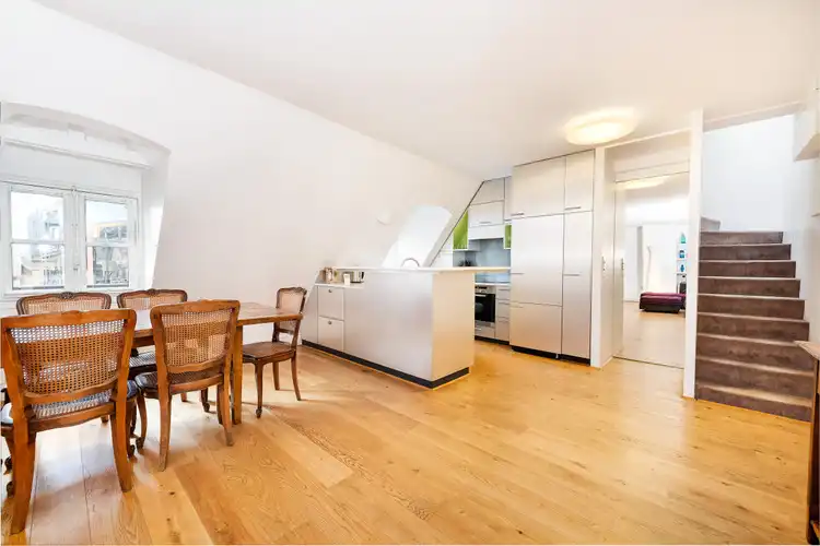 An ancient, stone-edged wooden portal leads to impeccably maintained common areas and a modern elevator that takes you quickly to the top floors.  The combined living room / dining room dominate the main floor of the 5th floor apartment and offer a wonderful entertaining space, with a modern open-style kitchen and an adjacent powder room. The great room has a bright loft-like feel that sets off the beautiful wood flooring and is accented with angled walls, echoing the historic architecture outside.  The upper level features two bright and airy bedrooms served by a full bathroom and plenty of storage space.  The property is completed by a storage cellar and a parking spot which can be acquired separately.