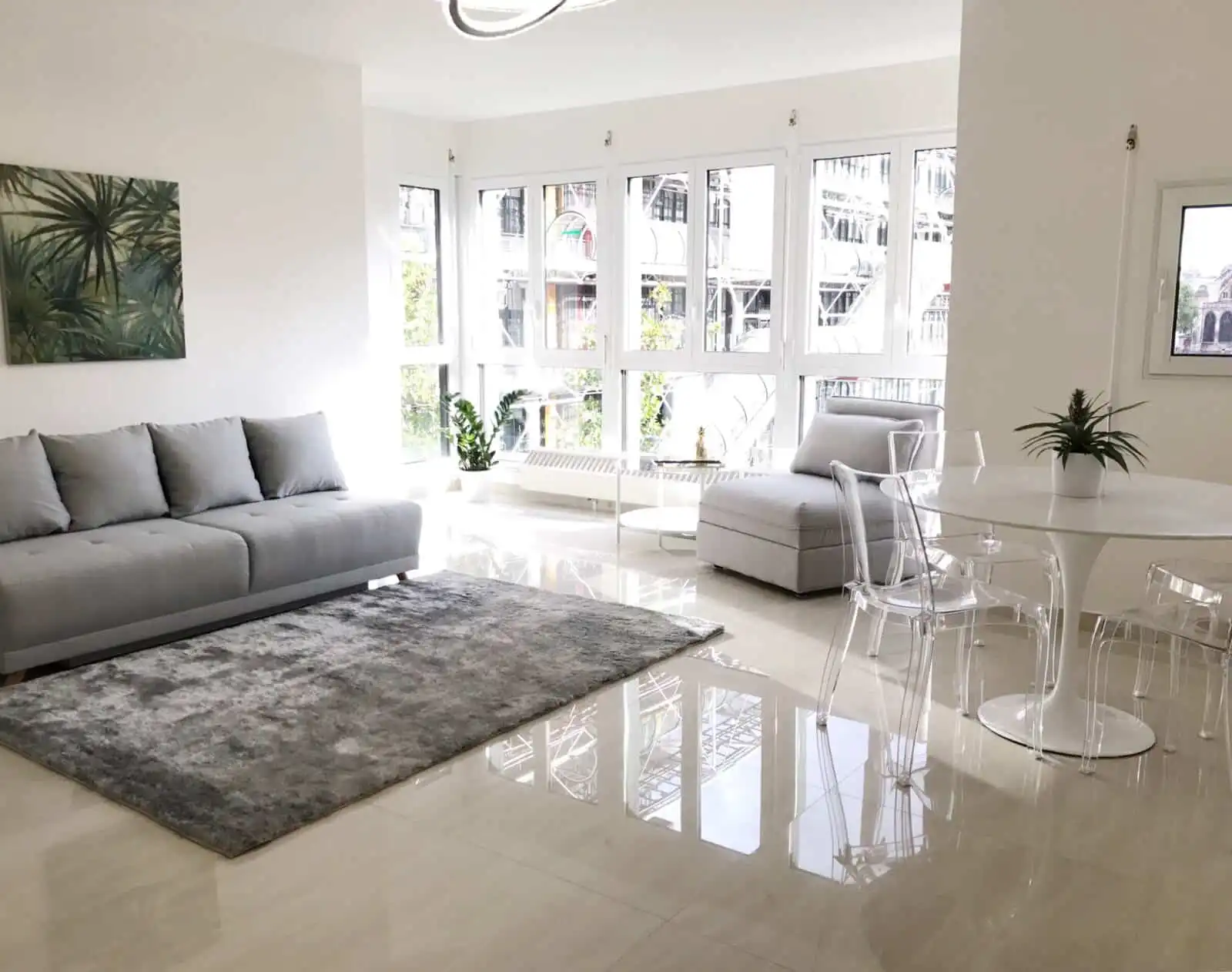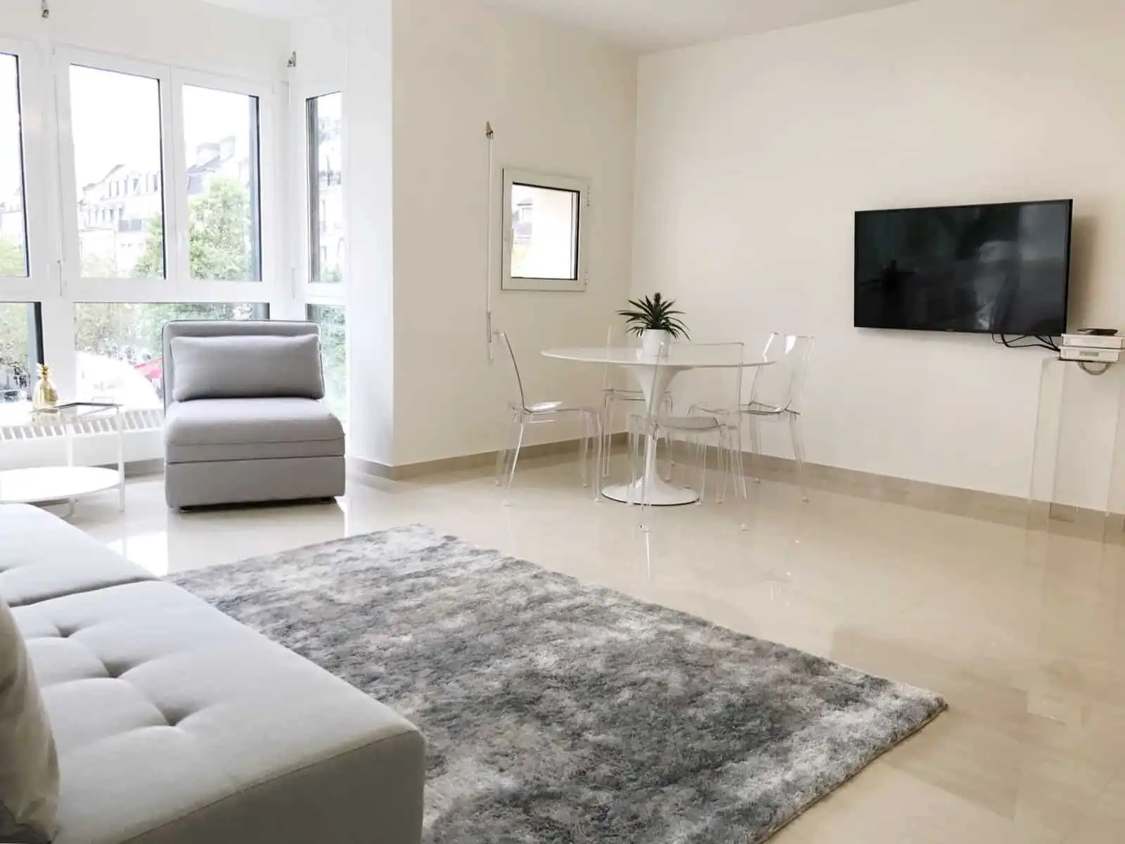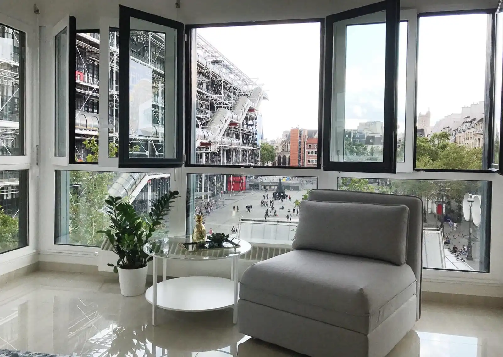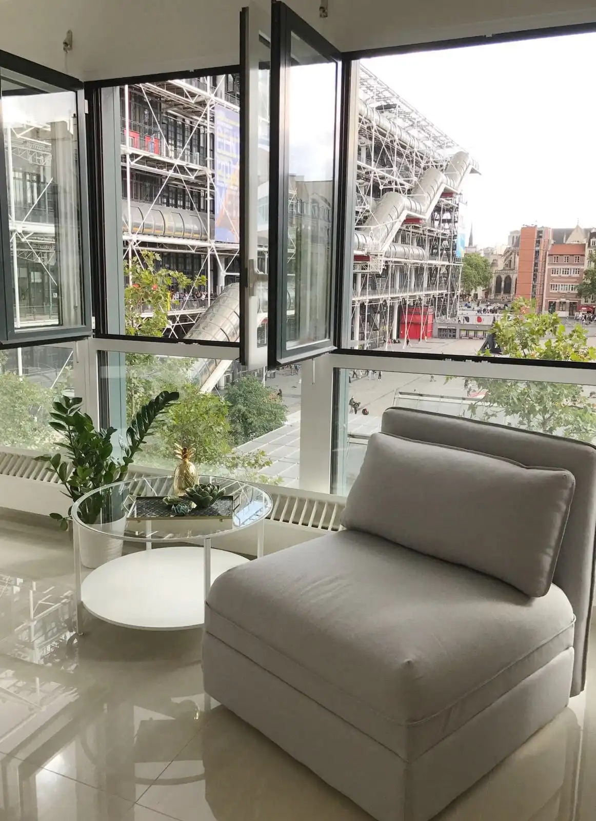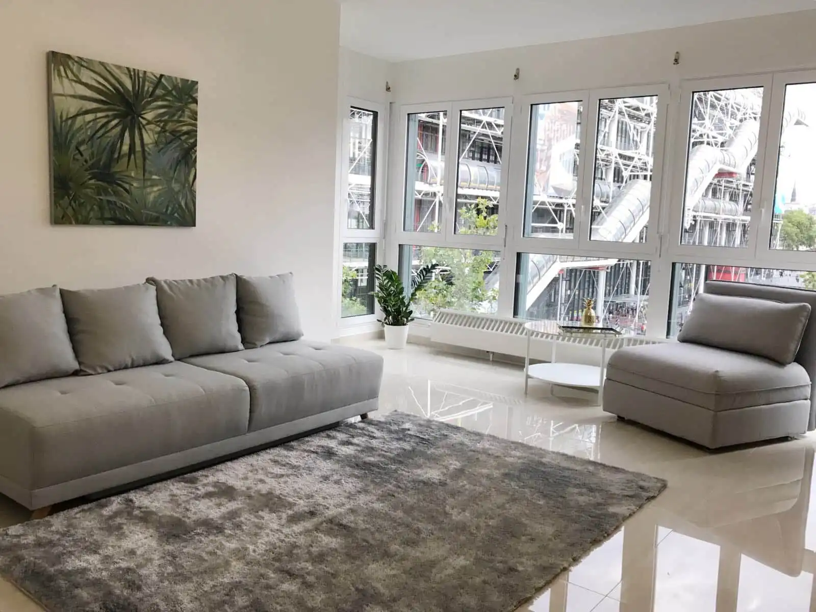 Two bed, one bath:  This pristine property, located on the third floor (with elevator) of a magnificient building (Grand standing) directly on the Place Georges Pompidou in the third arrondissement.  Rare open view, sunny and quiet while just steps from the vibrant Marais.  Open kitchen with vast living dining area and floor to ceiling views on open space.