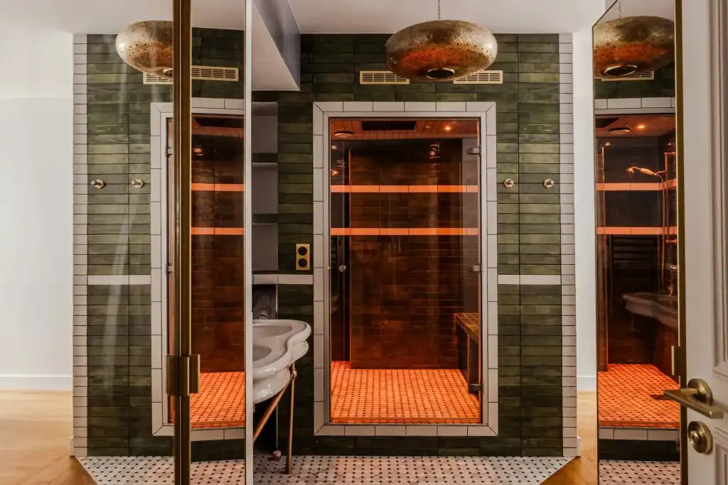 The main level opens with a generous entry, an open fully equipped kitchen, and a living room with soaring cathedral ceilings bathed in south and southeast light. The primary suite is its own retreat: en-suite bathroom, a hammam, and a separate guest powder room. Upstairs via a private interior staircase, two large bedrooms frame sweeping Paris rooftop views, a family room anchors the landing, and a full bathroom with in-unit laundry completes the floor.
